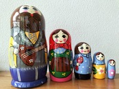 楽器を持つ音楽一家をモチーフにしたロシアの職人さんによるハンドメイドの作品です。ロシア伝統の原色系べた塗りのカラフルな木製工芸品・マトリョーシカです。自然木の香りがします。