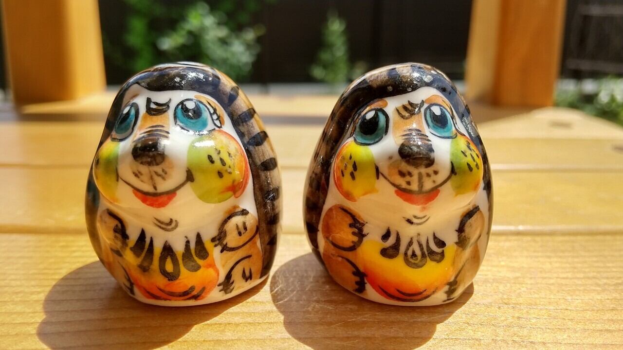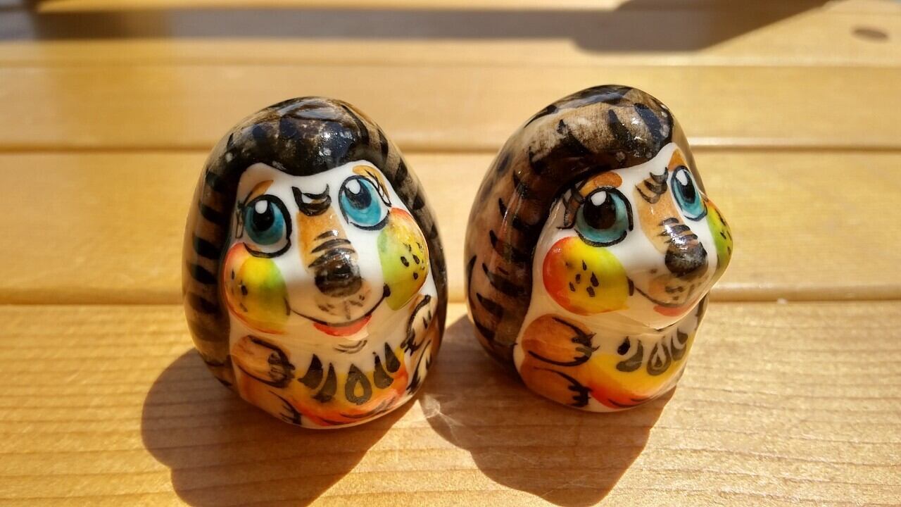 ロシアの伝統陶器、グジェリ焼きです。はりねずみ兄弟がモチーフになっています。2体セット、バラ売り不可です。