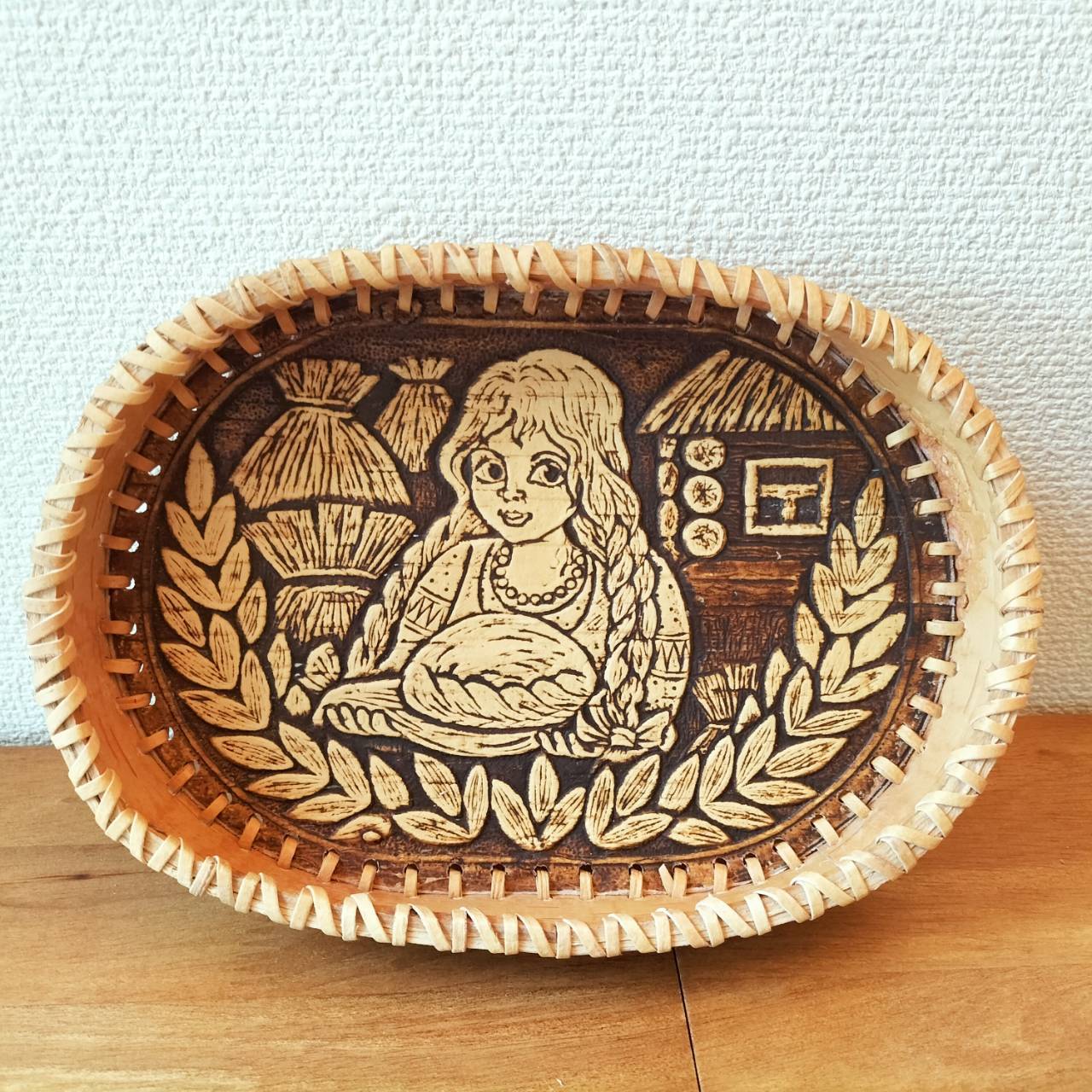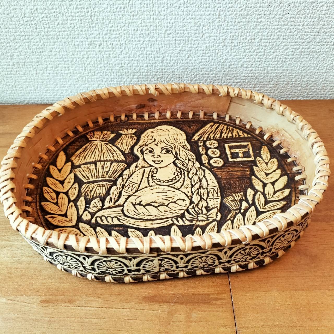 ロシア・北欧の小物入れ、ベレスタです。白樺の真皮で作られている白樺細工です。パンを焼く農村の女の子をモチーフにしています。ベレスタ職人のハンドメイド作品です。玄関のカギ入れやキャンディー入れにいかがでしょうか。