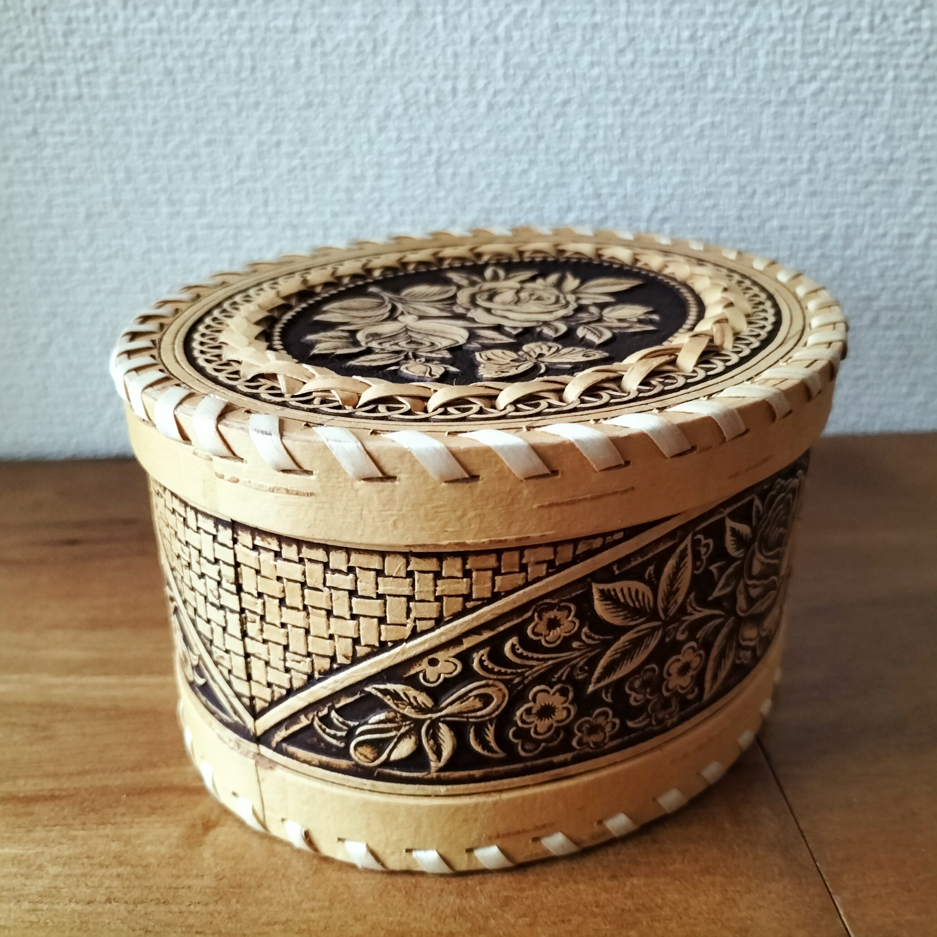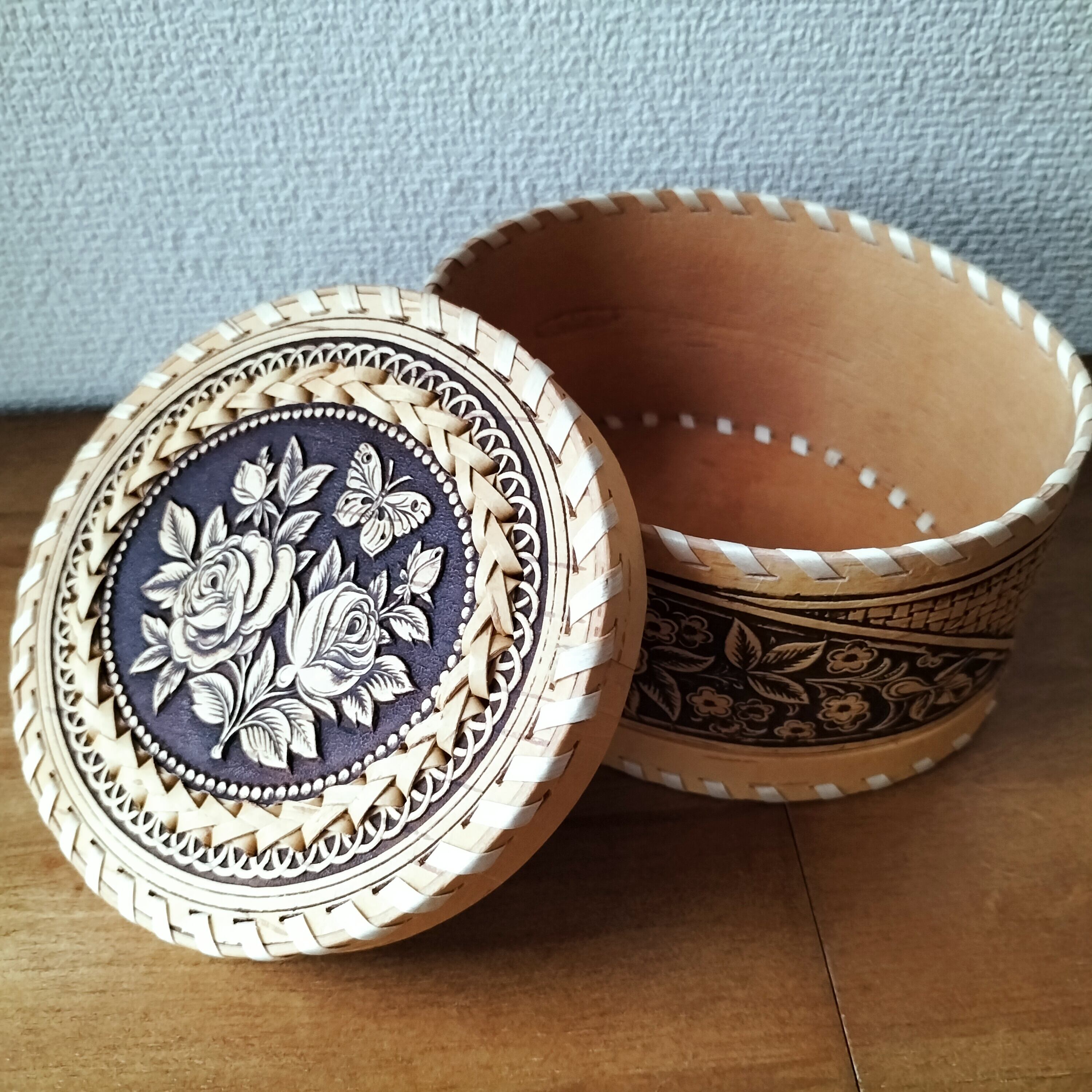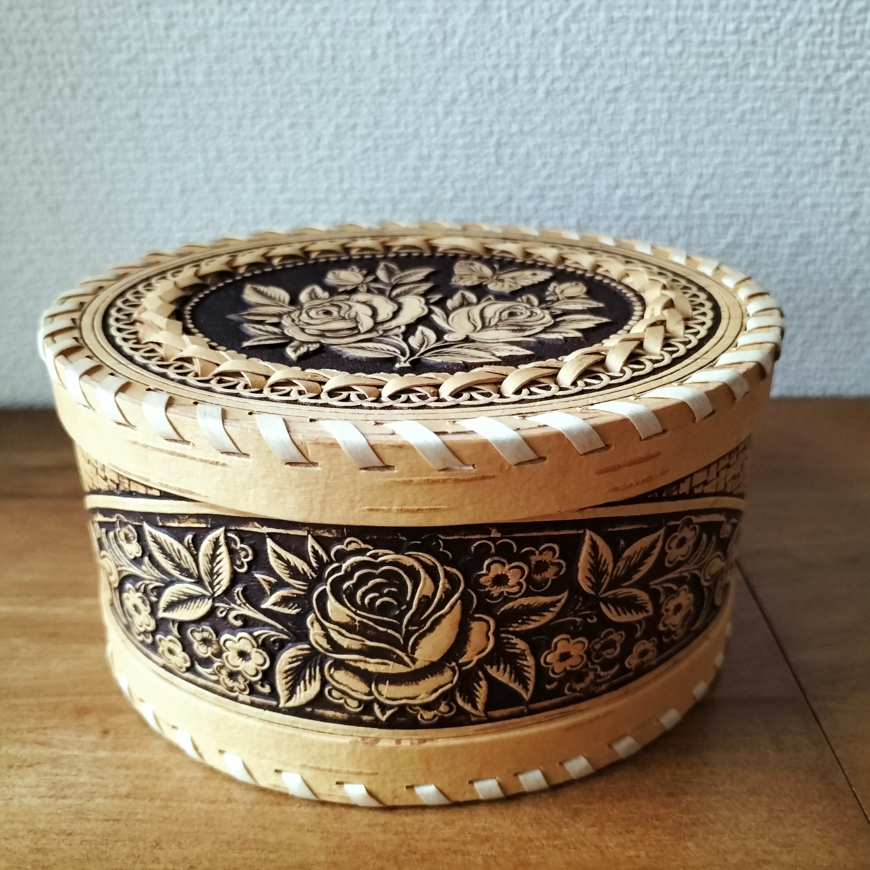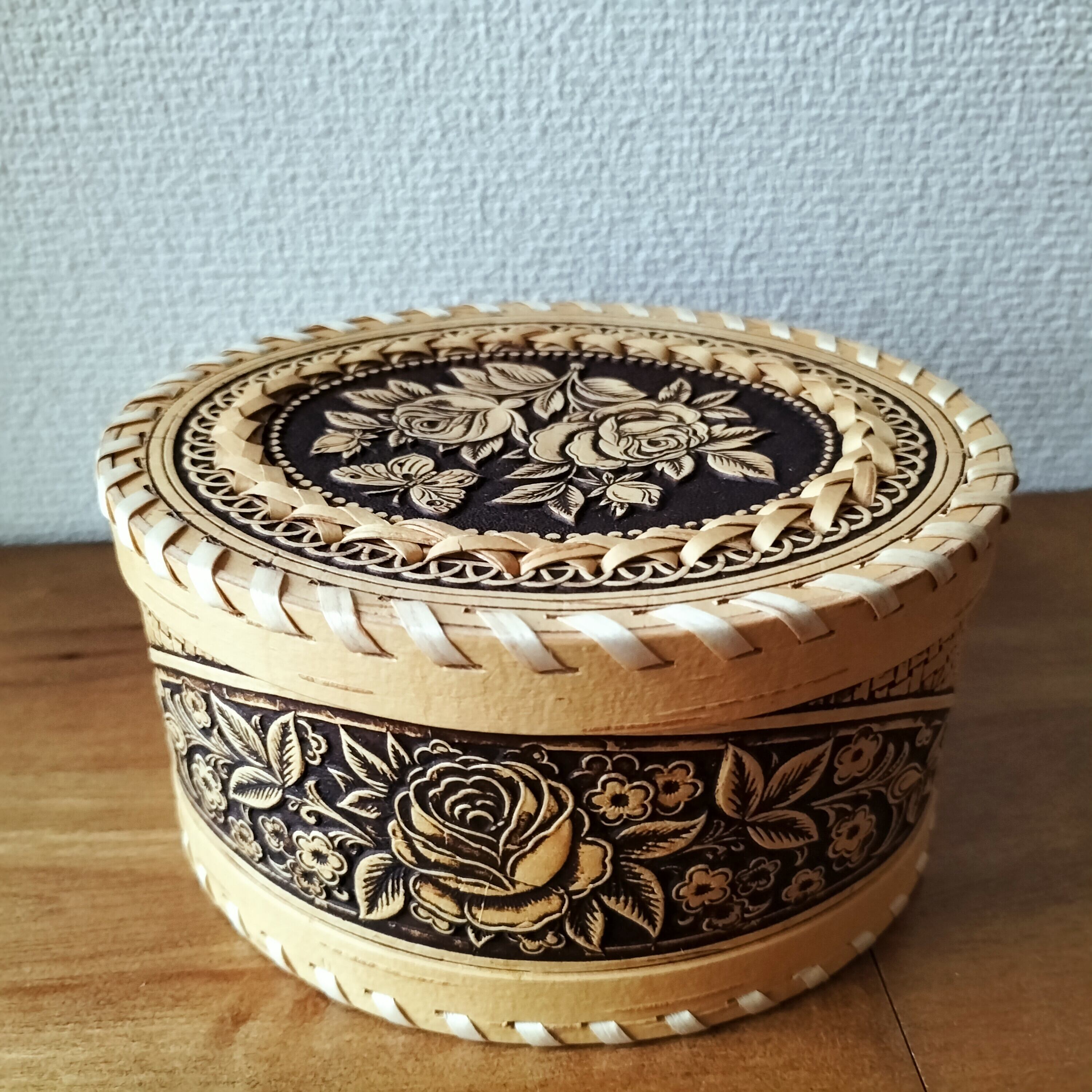 ロシア・北欧の小物入れ、ベレスタです。白樺の真皮で作られている白樺細工です。美しい野バラをモチーフにしています。ベレスタ職人のハンドメイド作品です。