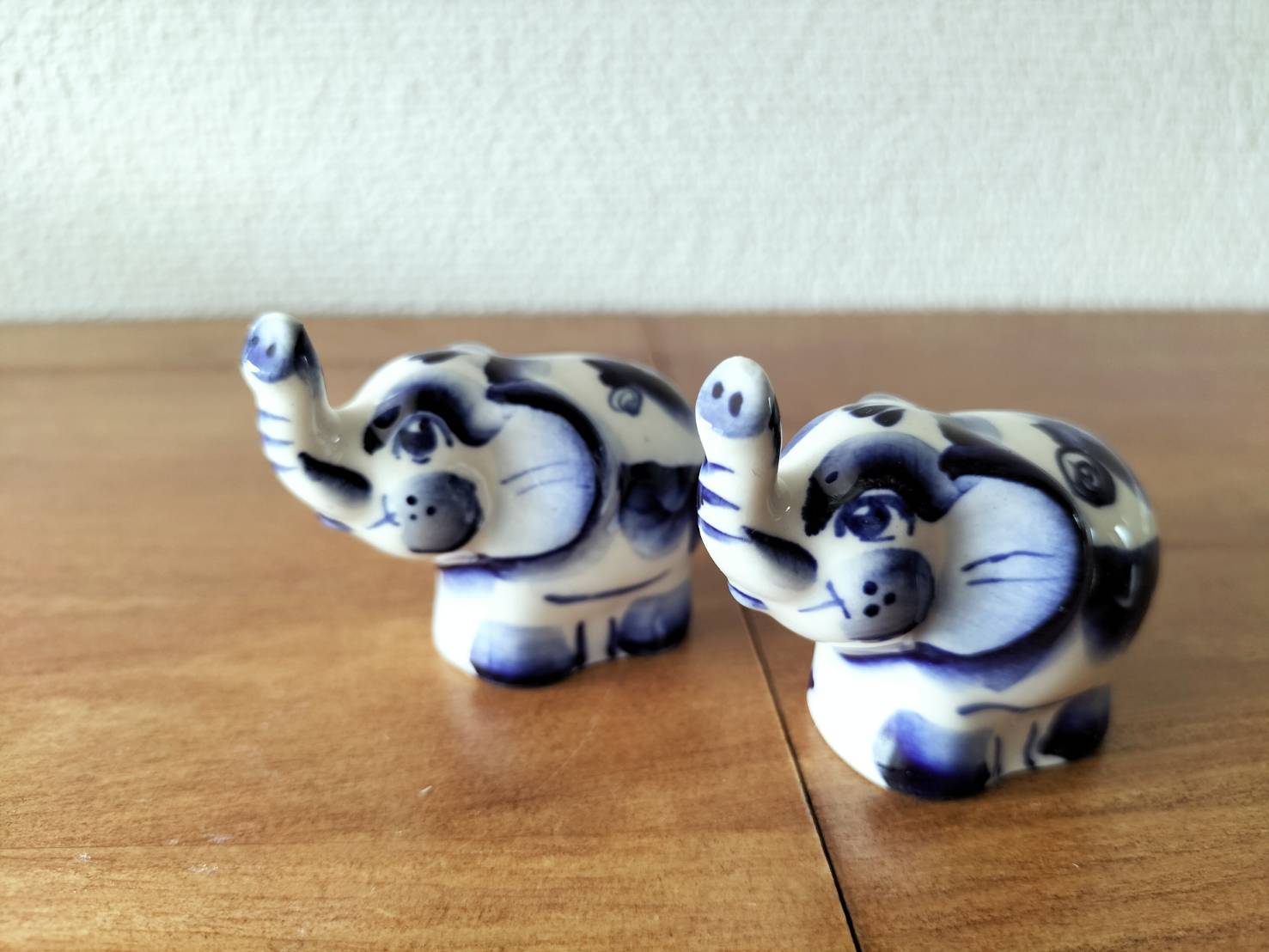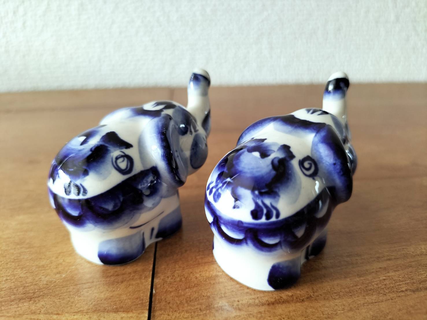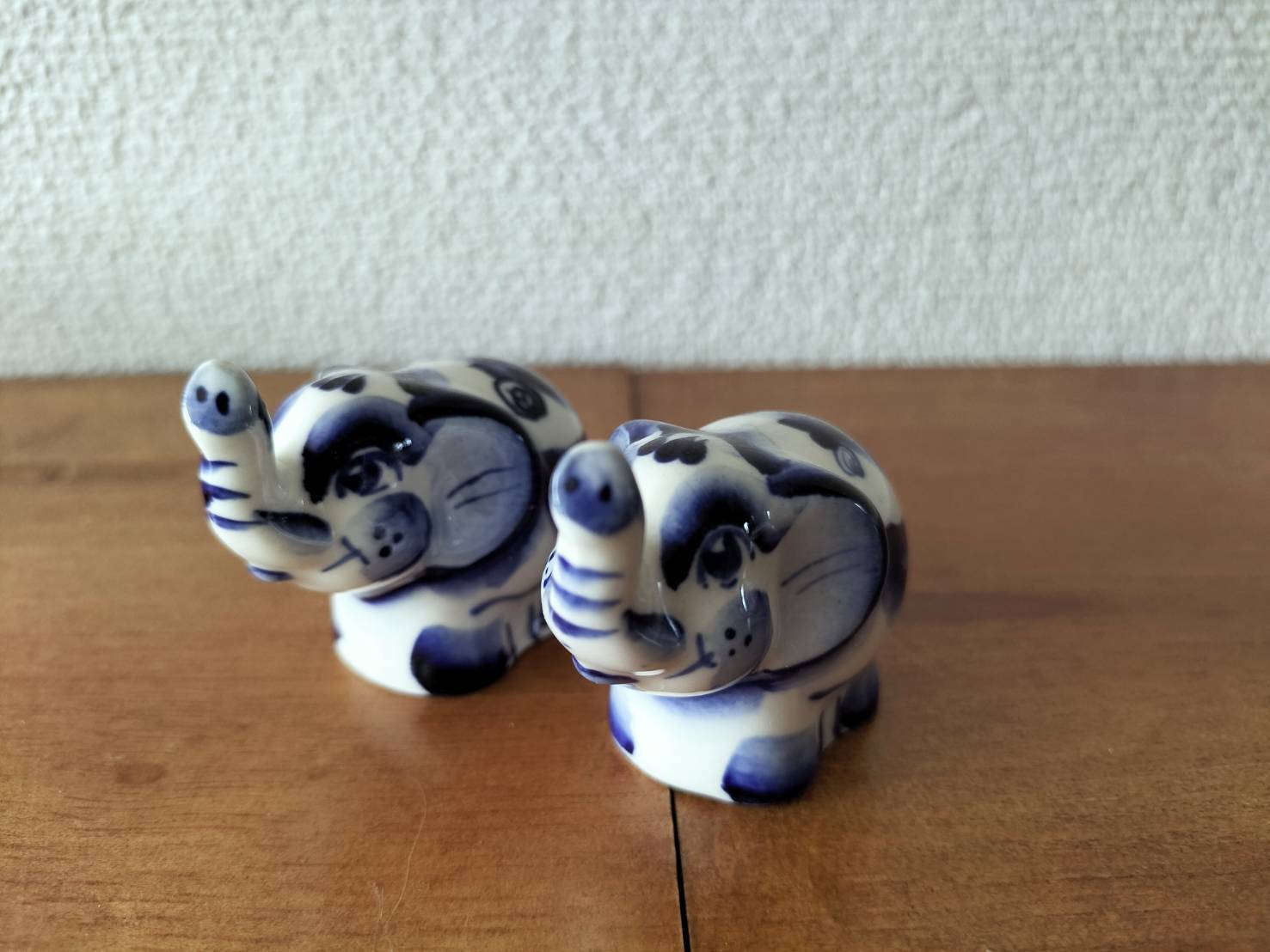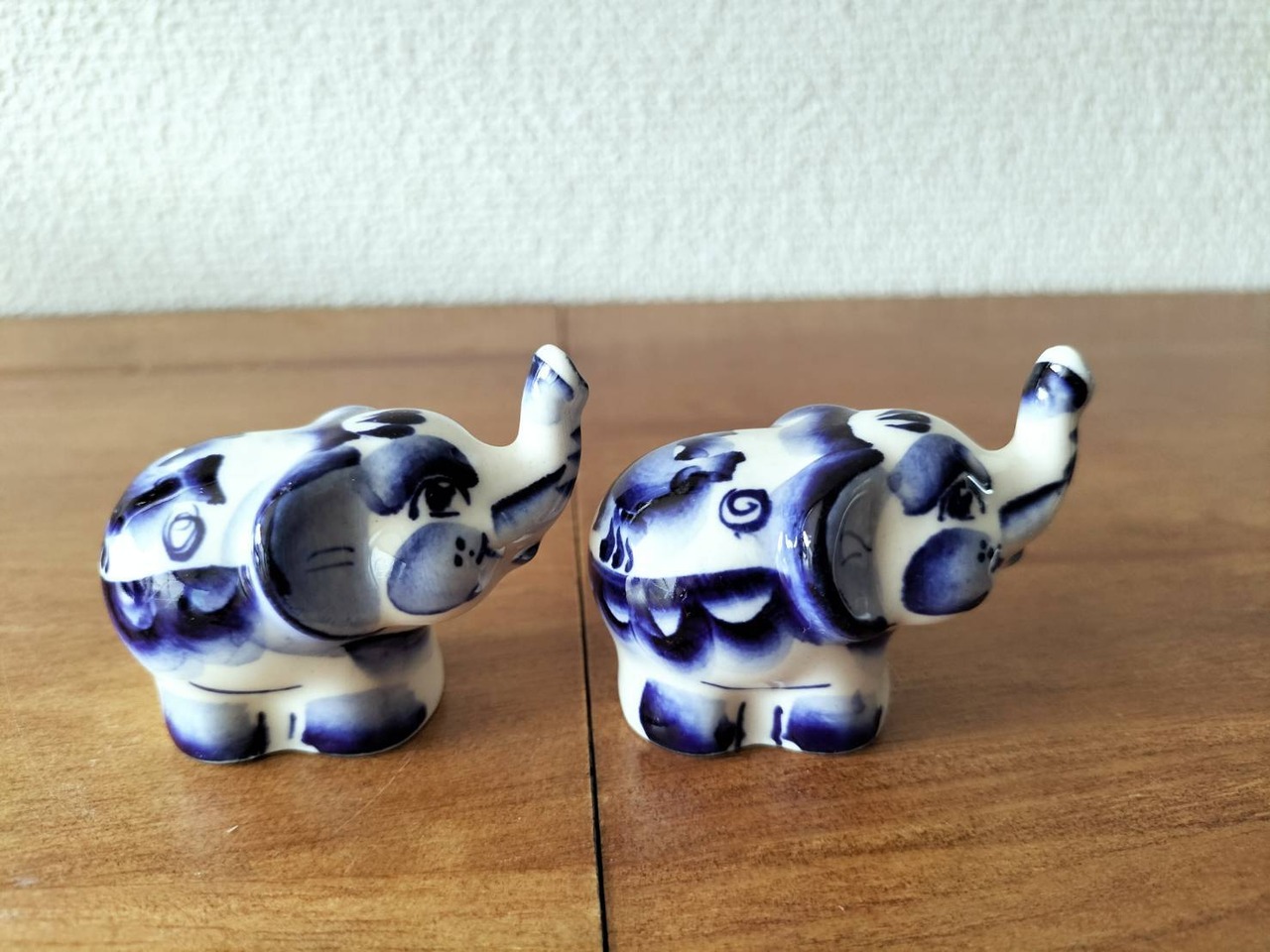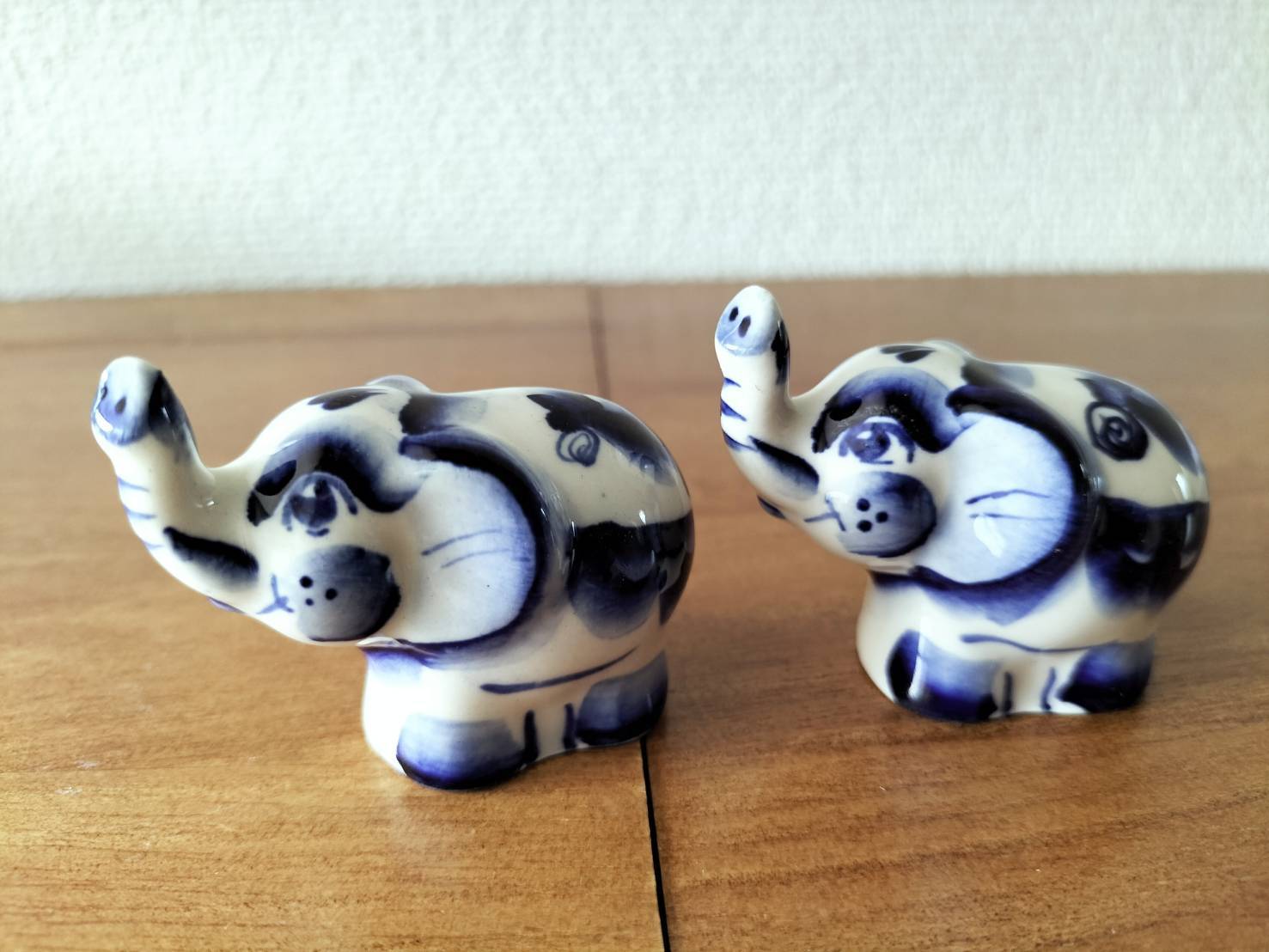 ロシアの伝統陶器、グジェリ焼きです。象のペアがモチーフになっています。2体セット、バラ売り不可です。
