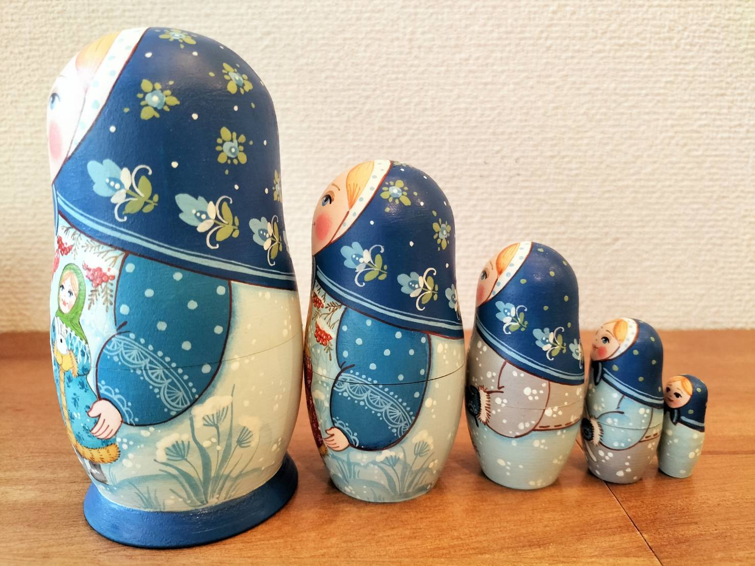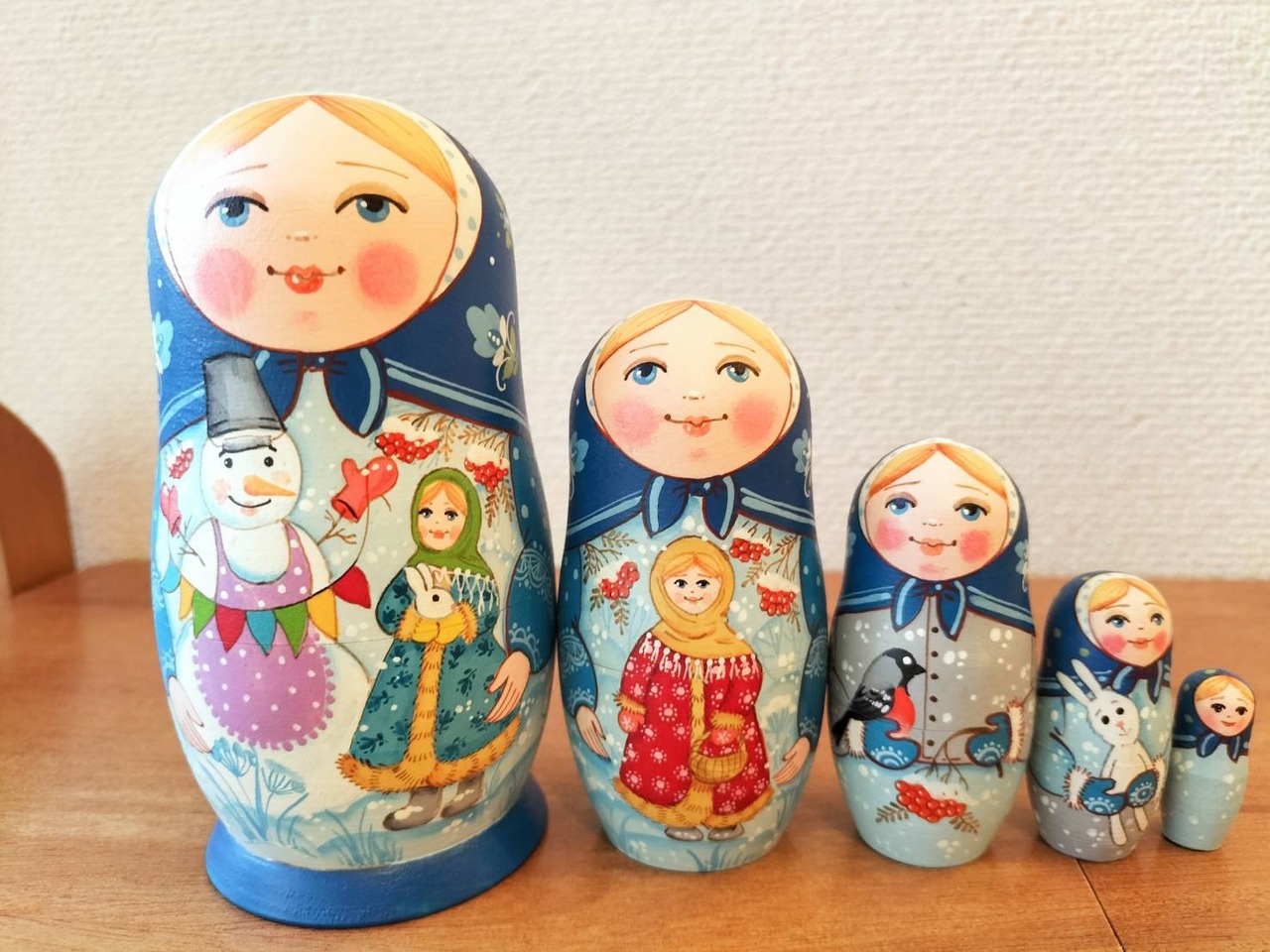 ロシアで有名なエレーナ・イワンツォワさんという作家さんのマトリョーシカです。ロシアの冬の風物詩である、ウソとリャビーナ(ナナカマド)をモチーフにしています。