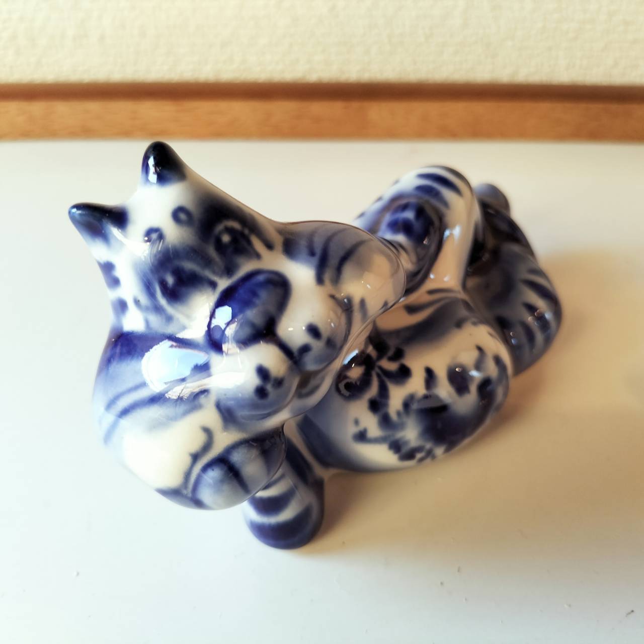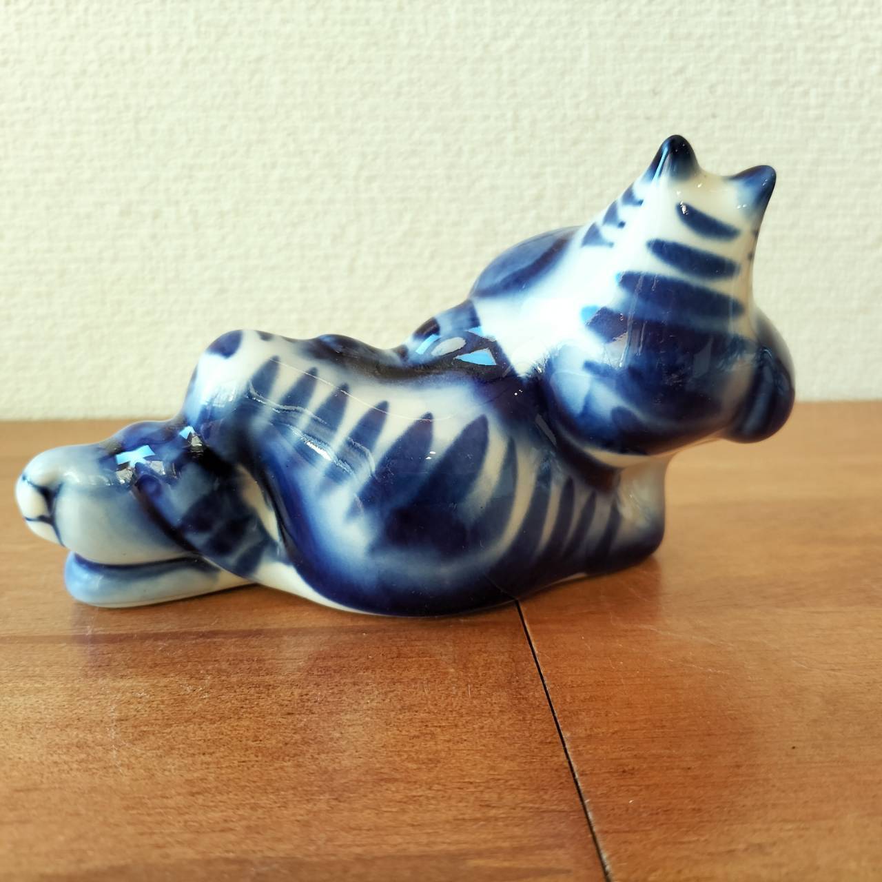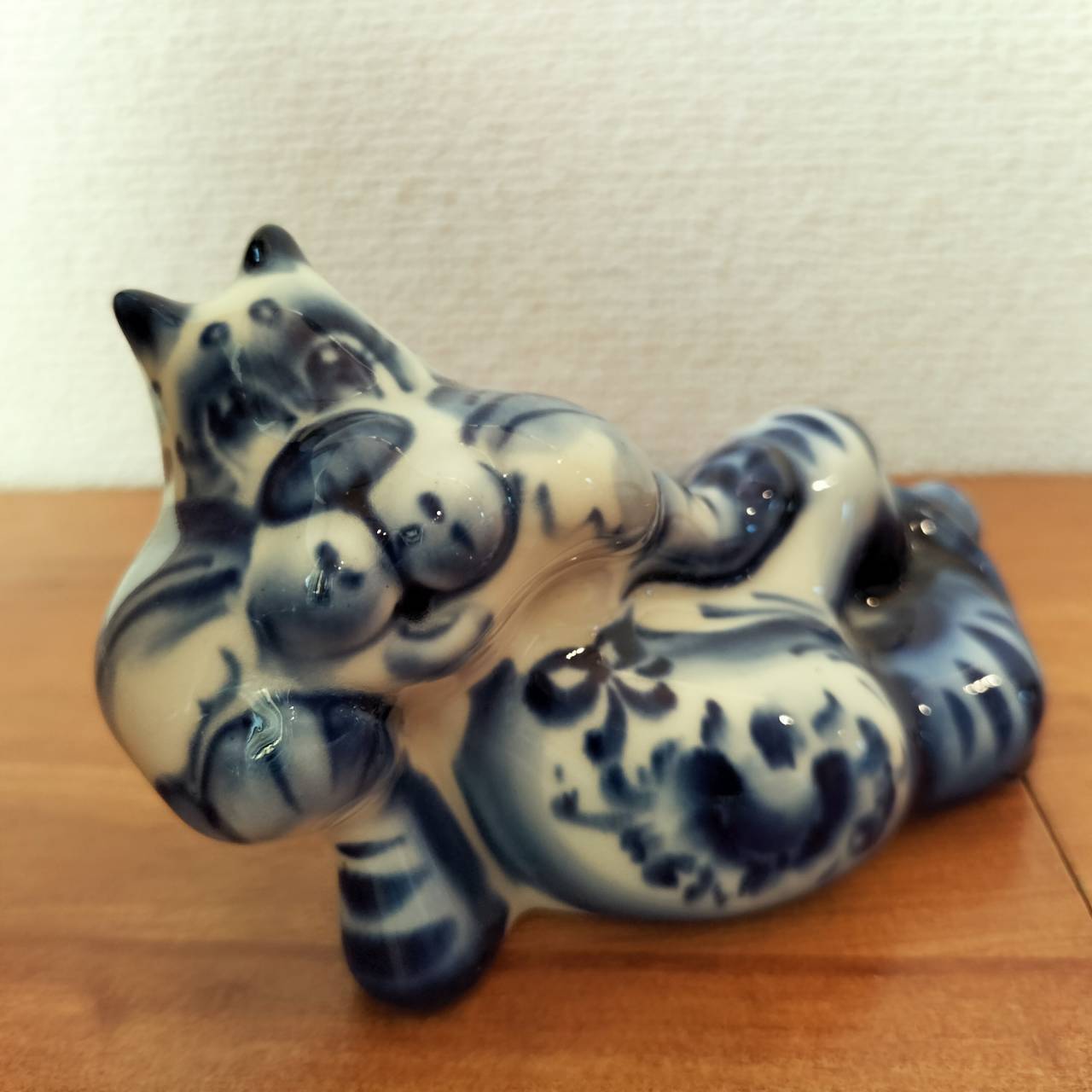 ロシアの伝統陶器、グジェリ焼きです。怠惰なぐうたら猫がモチーフになっています。