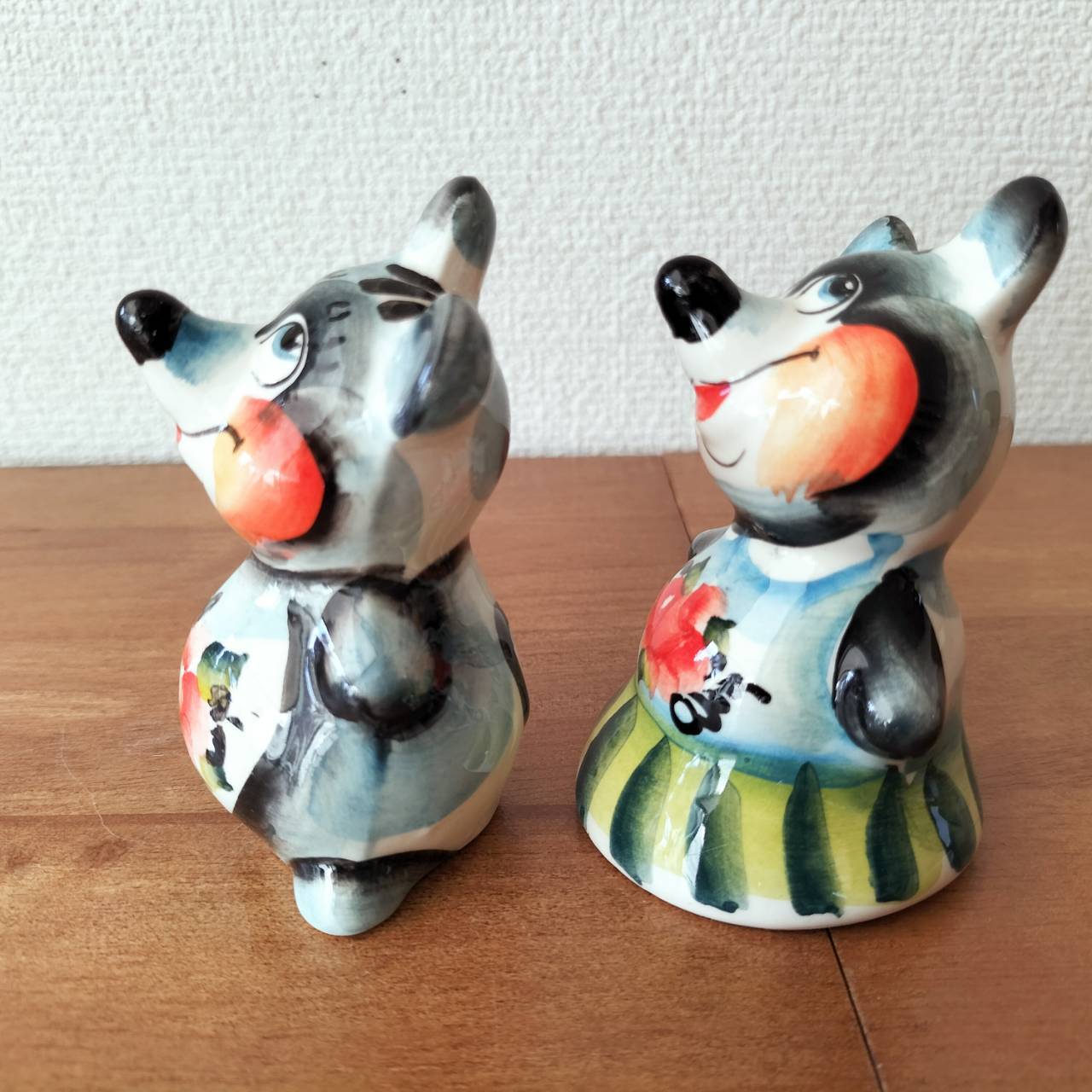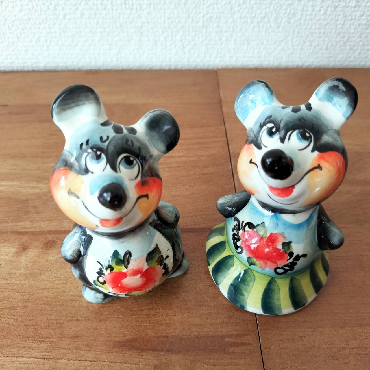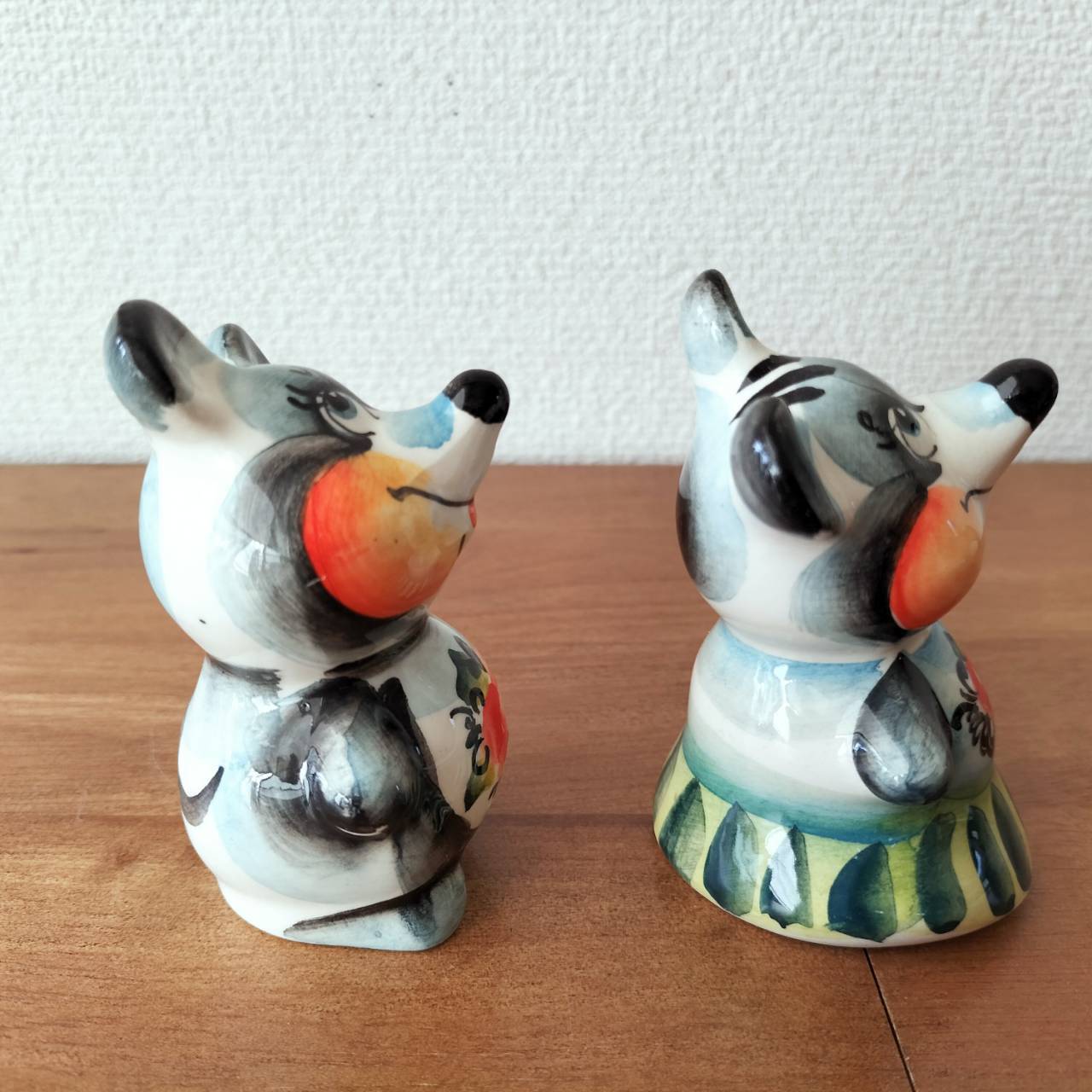 ロシアの伝統陶器、グジェリ焼きです。フランダンスのねずみカップルがモチーフになっています。2個セットバラ売り不可です。