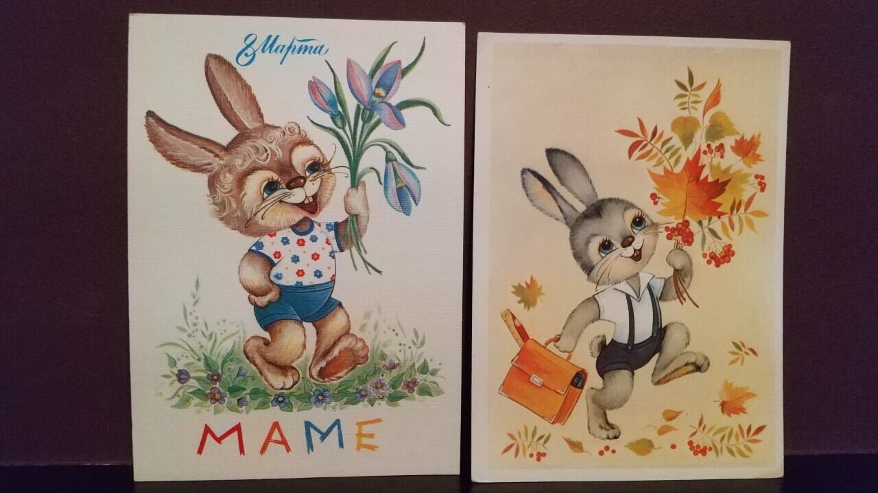 ソ連のヴィンテージ絵葉書です。うさぎがモチーフのレトロなポストカードです。2枚セット、バラ売り不可です。