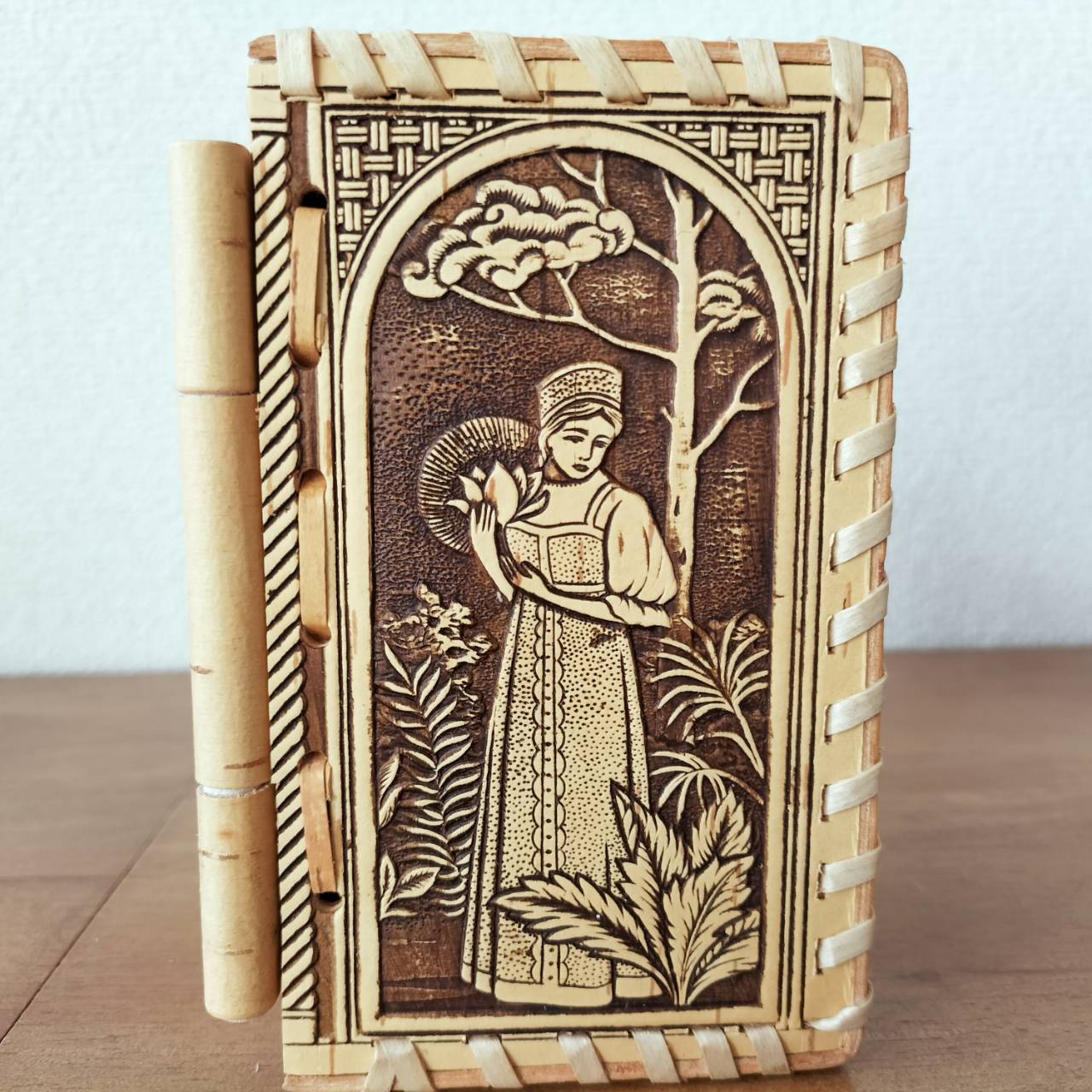 ロシア・北欧の小物入れ、ベレスタです。白樺の真皮で作られている白樺細工です。ベレスタ職人のハンドメイド作品です。スラヴの娘をモチーフにしたベレスタです。