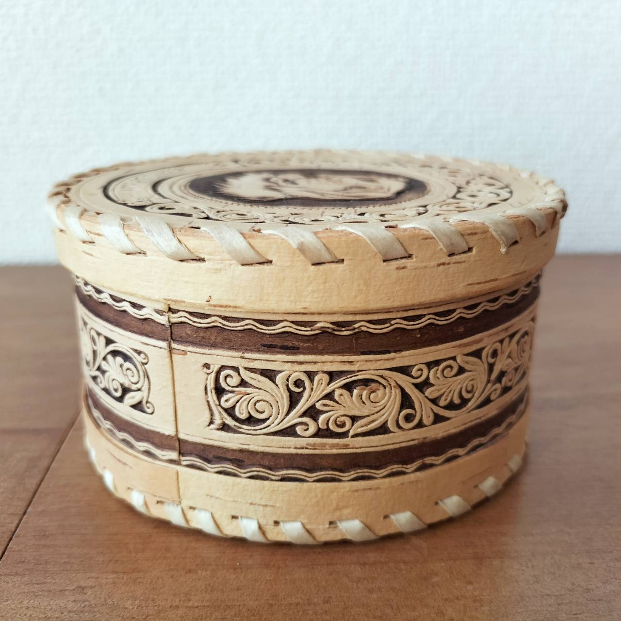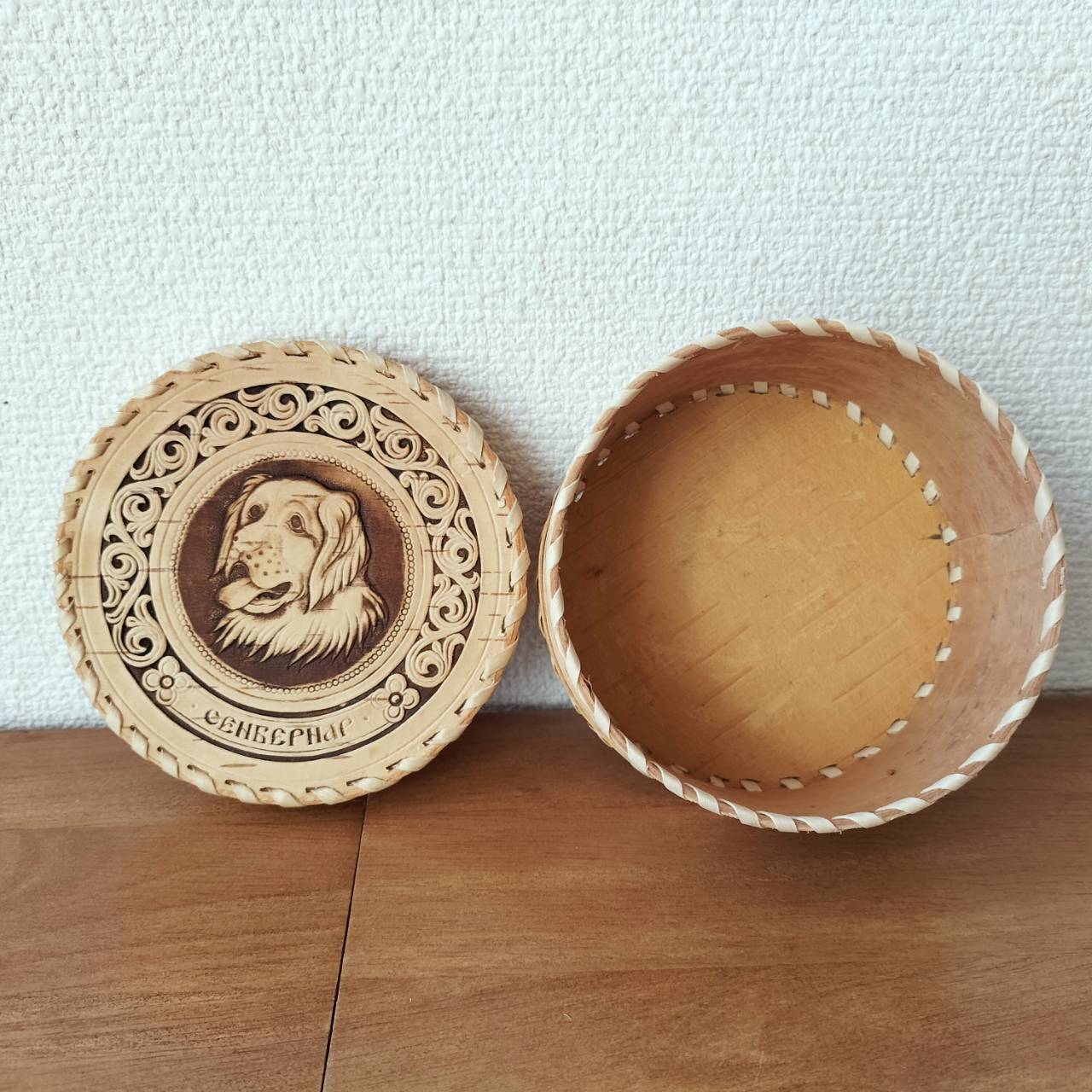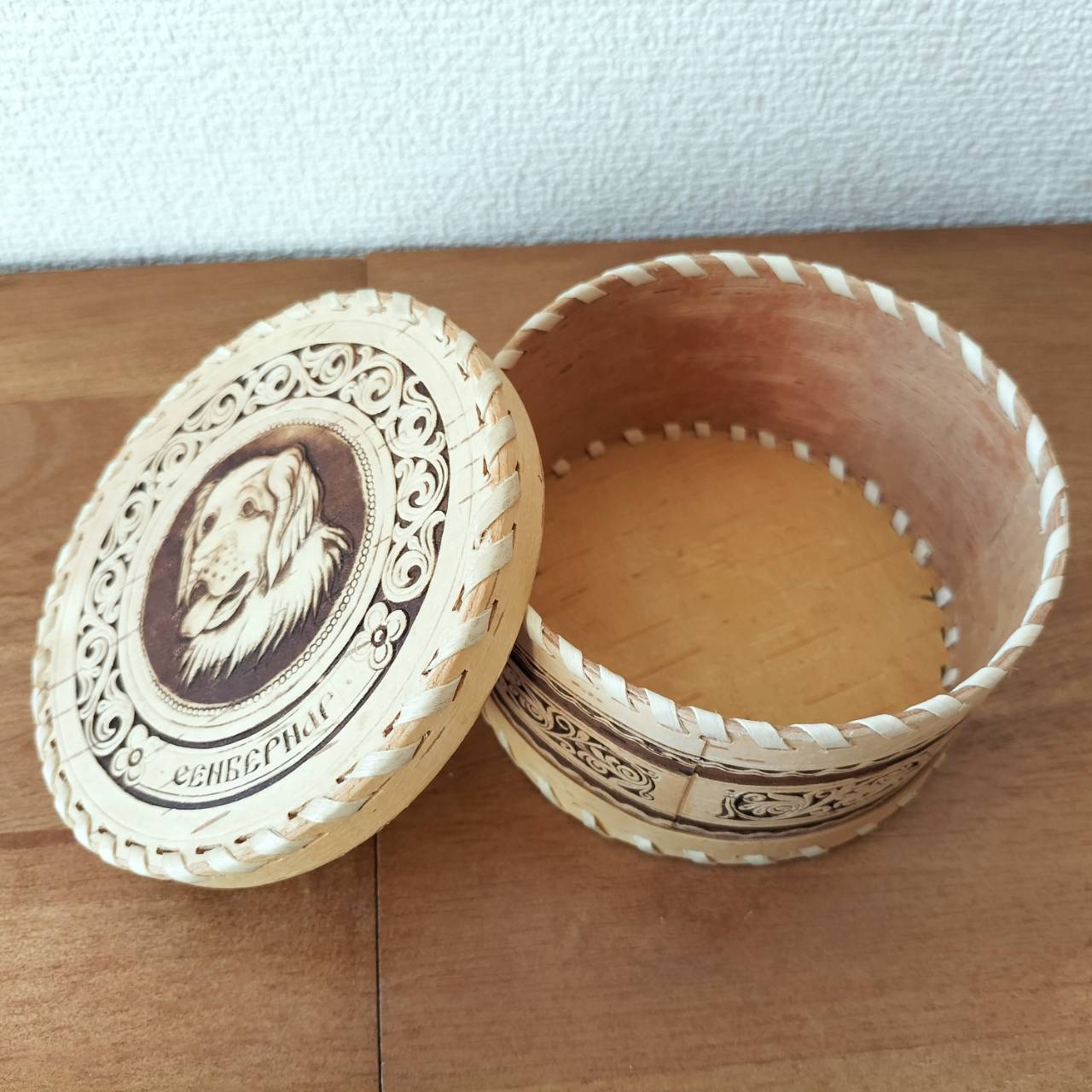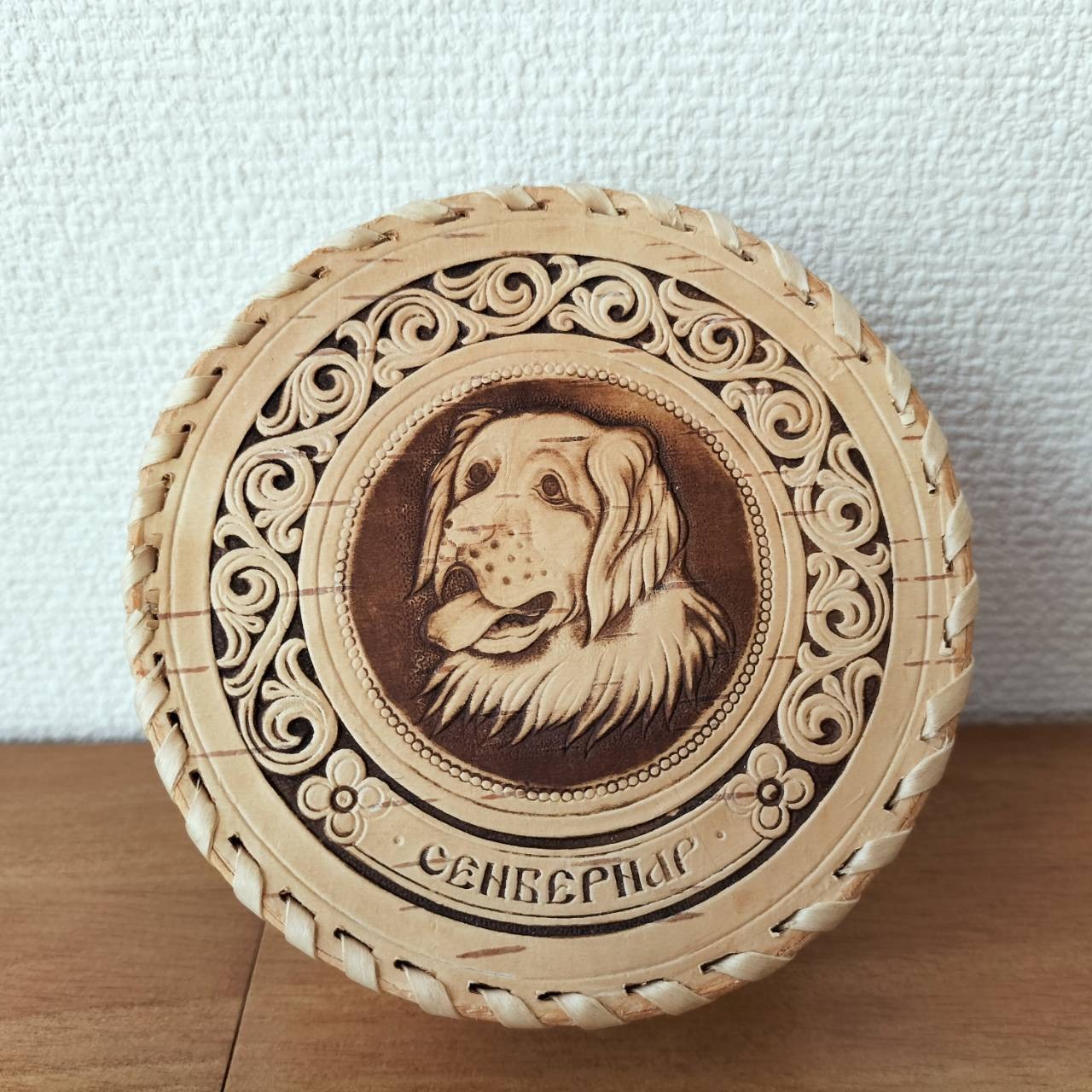 ロシア・北欧の小物入れ、ベレスタです。白樺の真皮で作られている白樺細工です。ベレスタ職人のハンドメイド作品です。犬をモチーフにしたベレスタです。