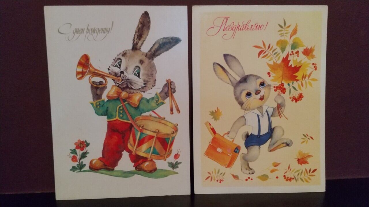 ソ連のヴィンテージ絵葉書です。うさぎがモチーフのレトロなポストカードです。2枚セット、バラ売り不可です。