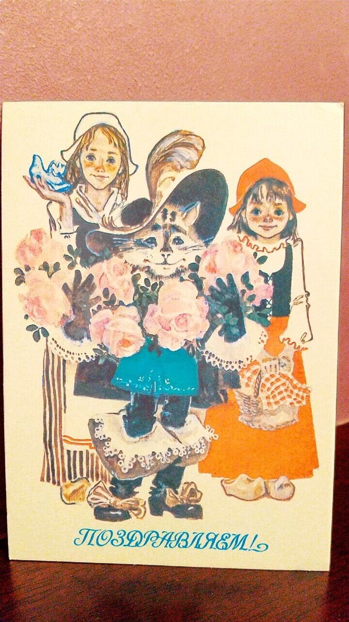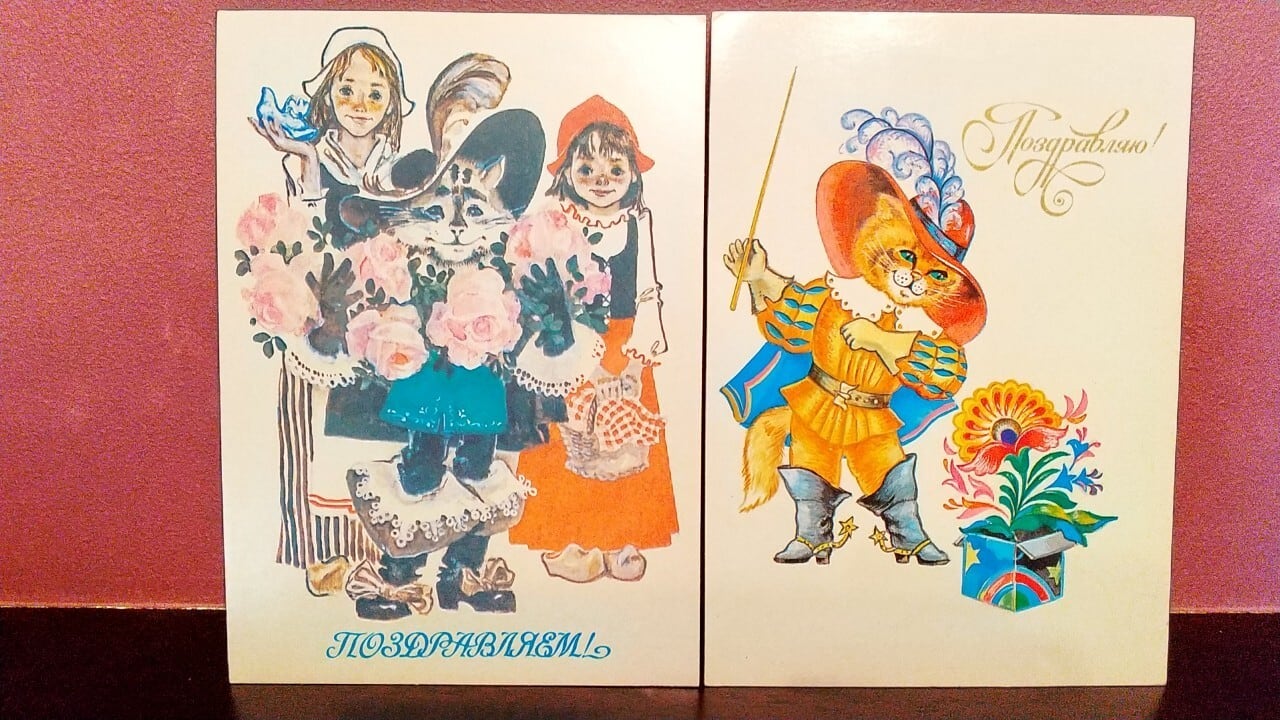 ソ連のヴィンテージ絵葉書です。長靴をはいた猫がモチーフのレトロなポストカードです。2枚セット、ばら売り不可です。