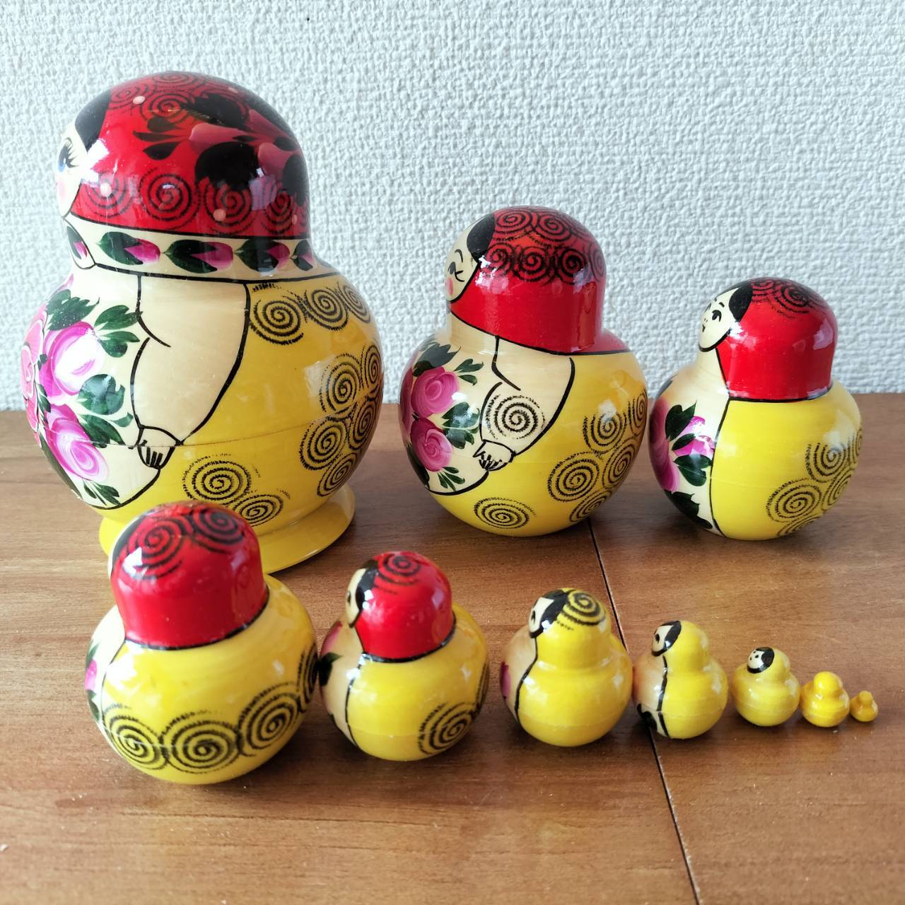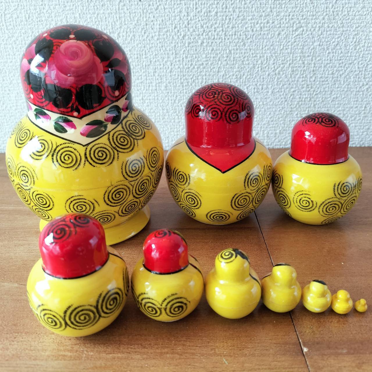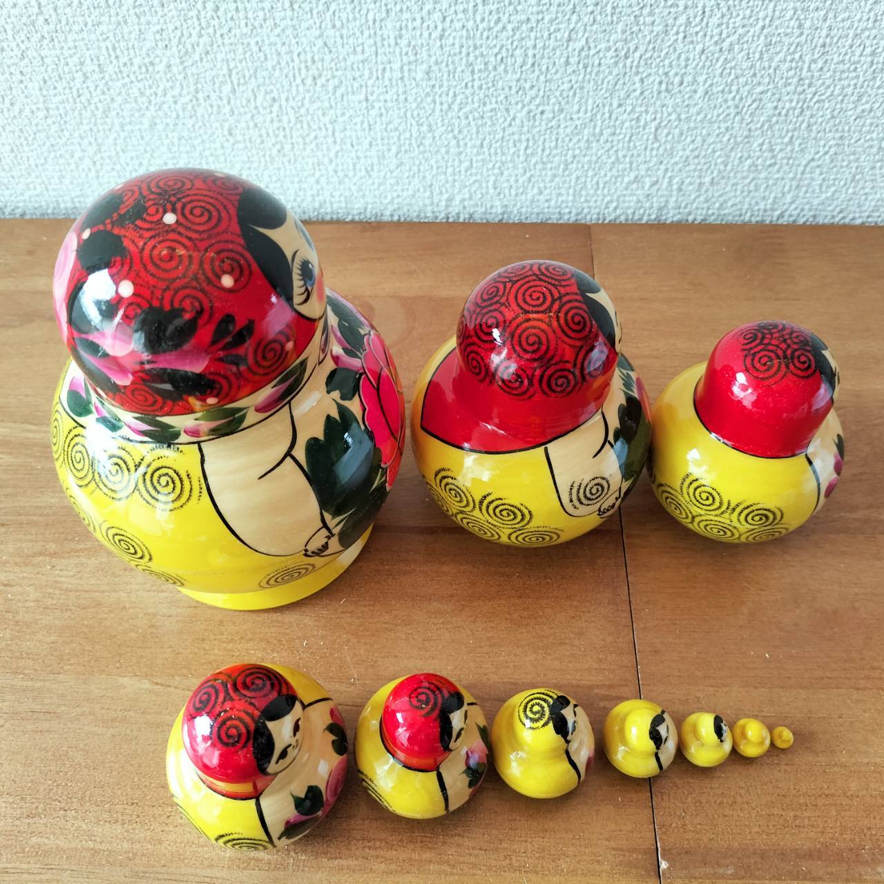 ロシアの職人さんによるハンドメイドの作品です。ロシア伝統の原色系べた塗りのカラフルな木製工芸品・マトリョーシカです。自然木の香りがします。