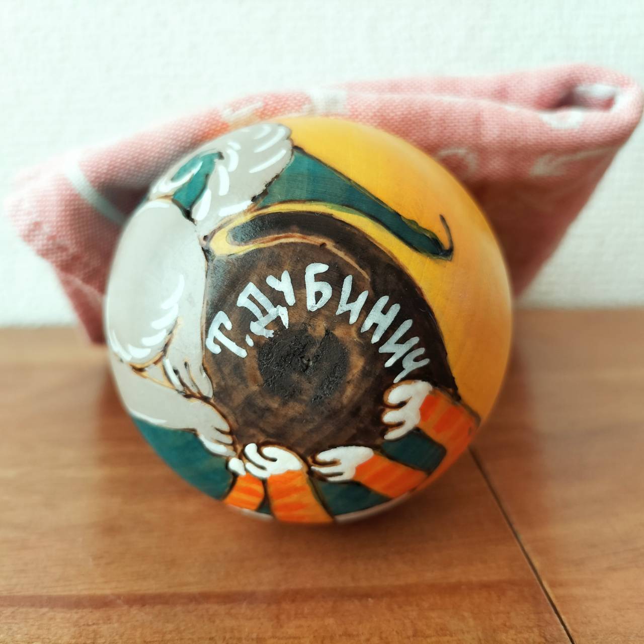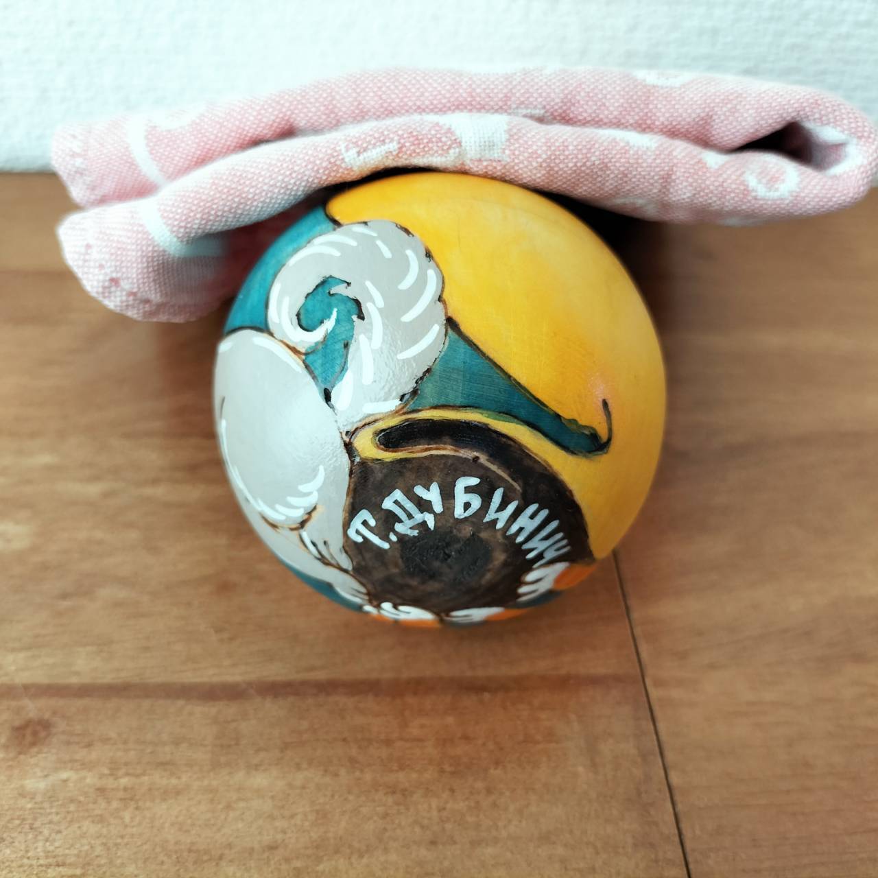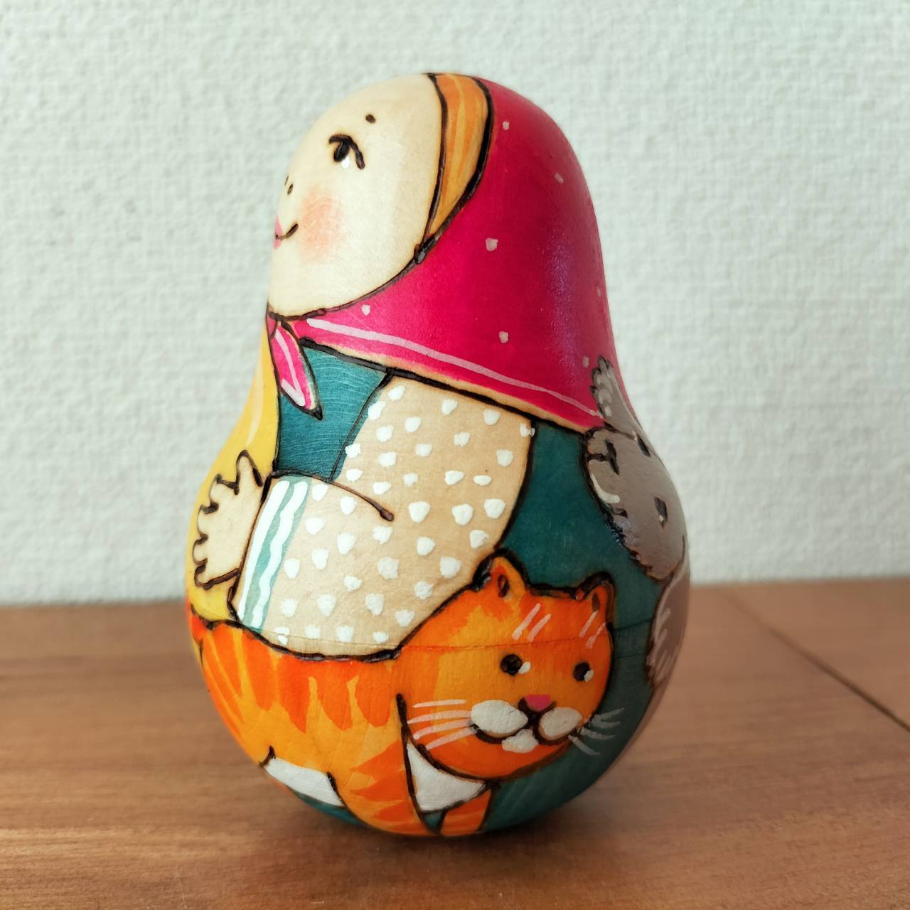 ロシアでとても有名なタチヤナ・ドゥビニッチさんという作家の起き上がりこぼしです。前後左右に転がすと、カランコロンと音が出て、元の位置に戻ります。
