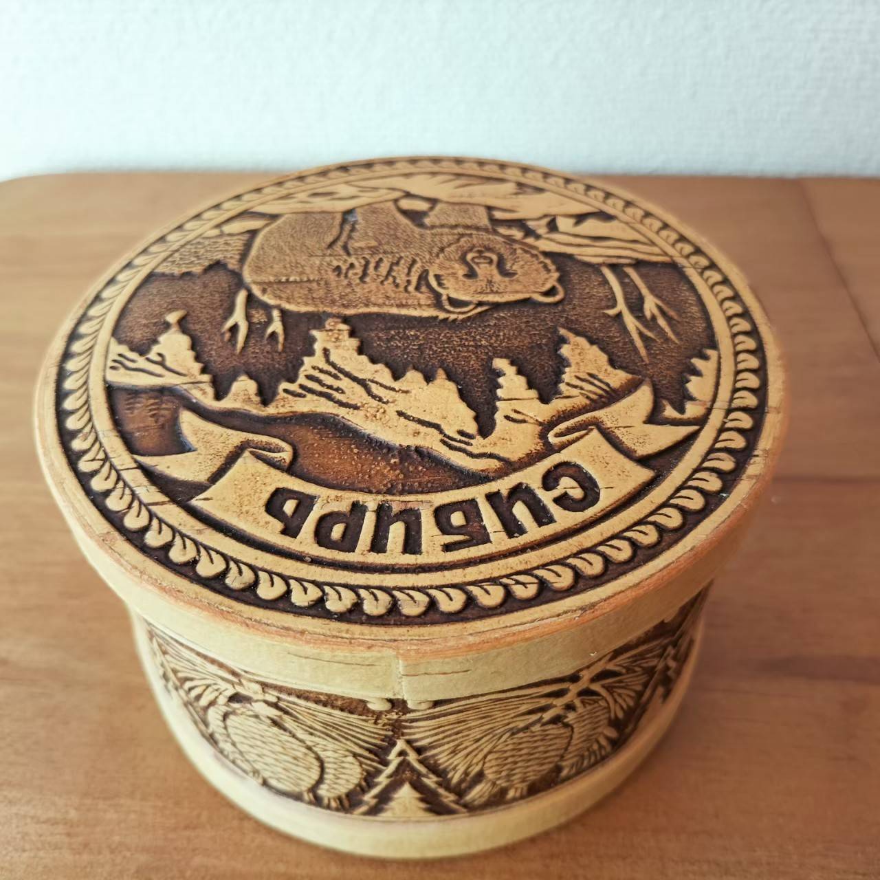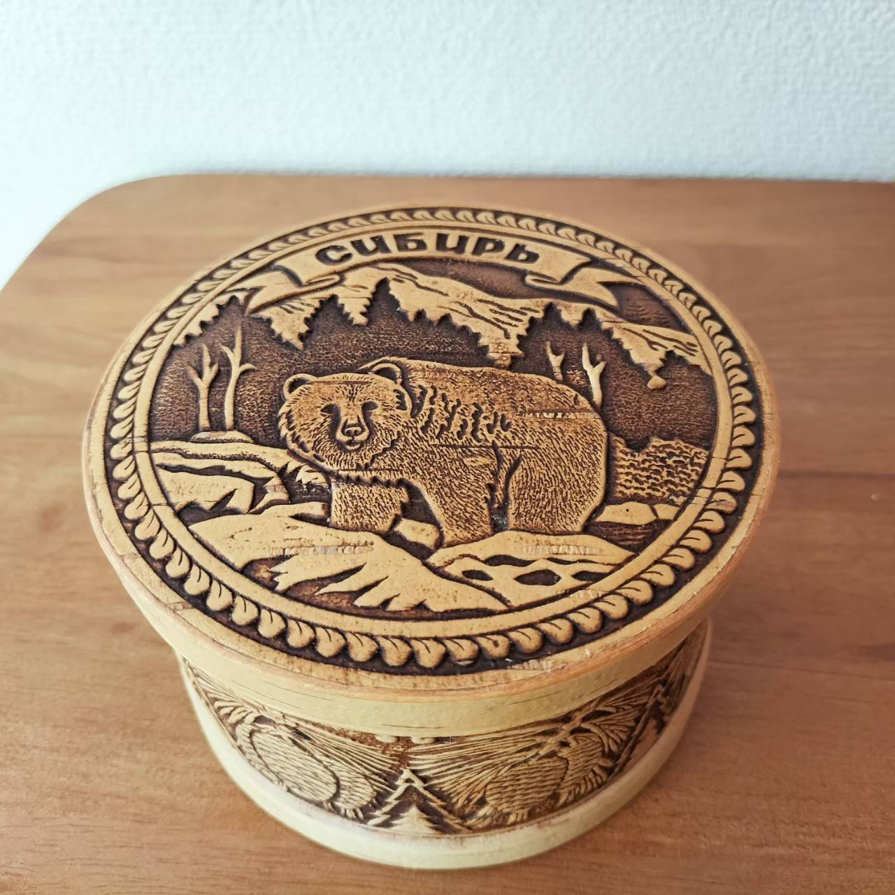 ロシア・北欧の小物入れ、ベレスタです。白樺の真皮で作られている白樺細工です。森の中にいる熊をモチーフにしています。ベレスタ職人のハンドメイド作品です。