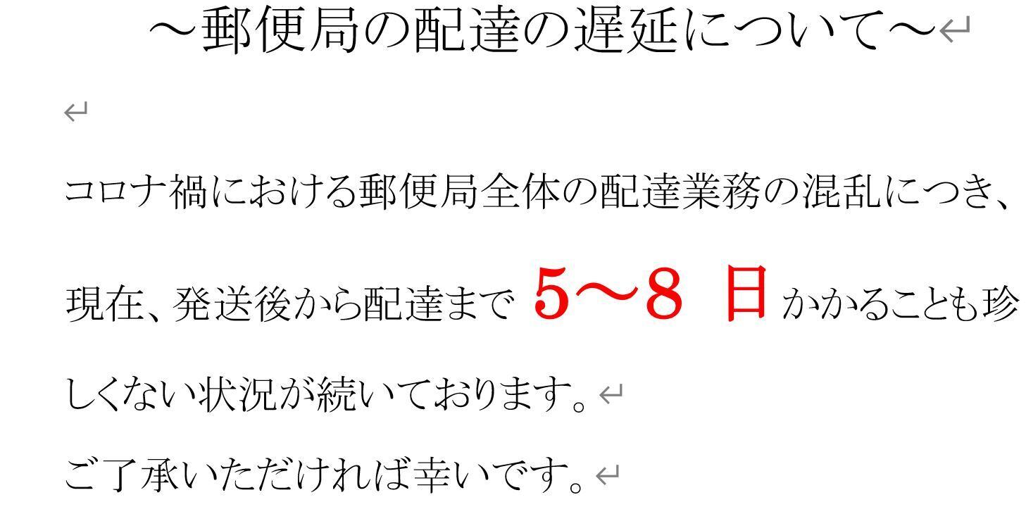 ●郵便局職員のコロナ感染拡大により、現在、発送から到着までに5日以上かかることがあっても珍しくない状況です。