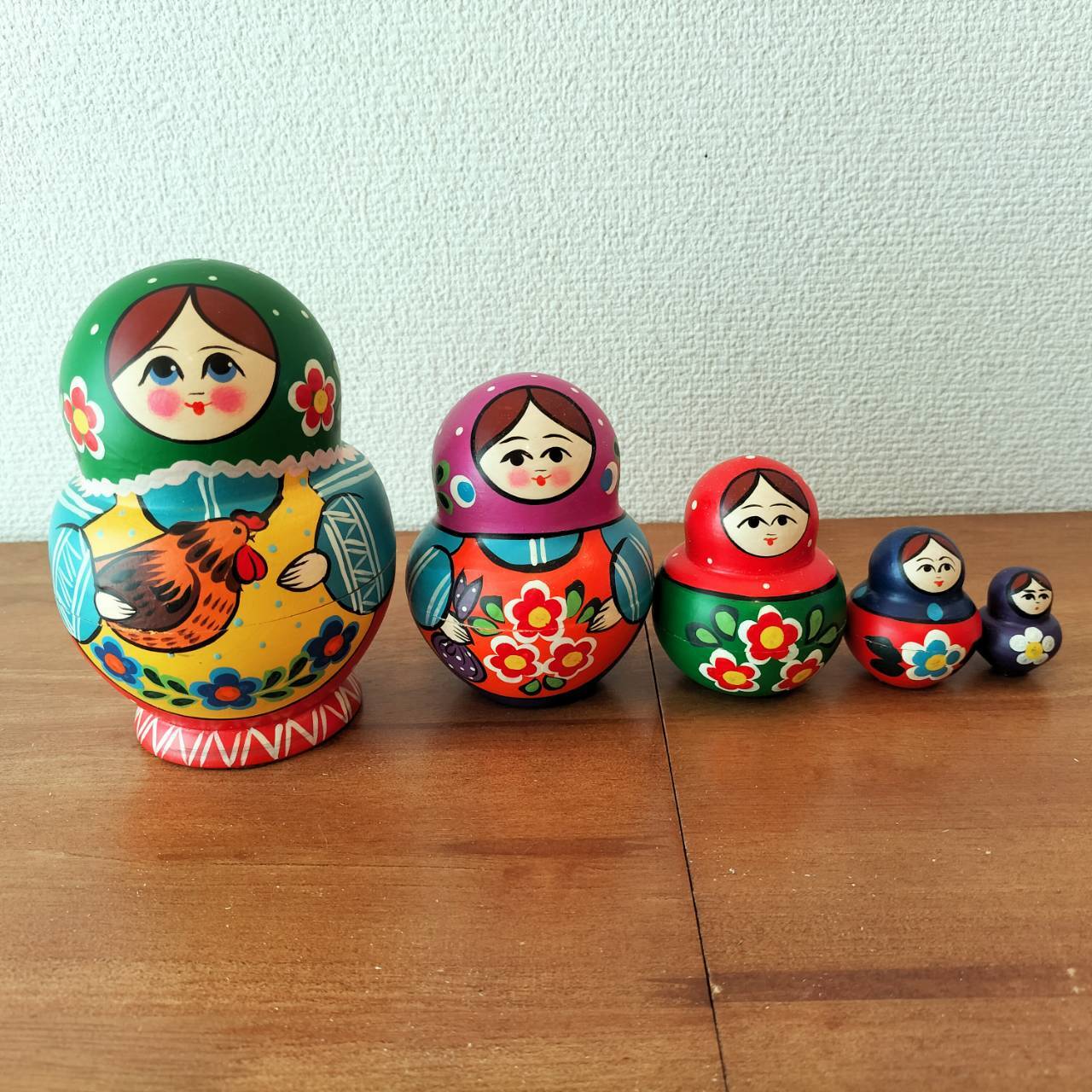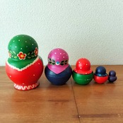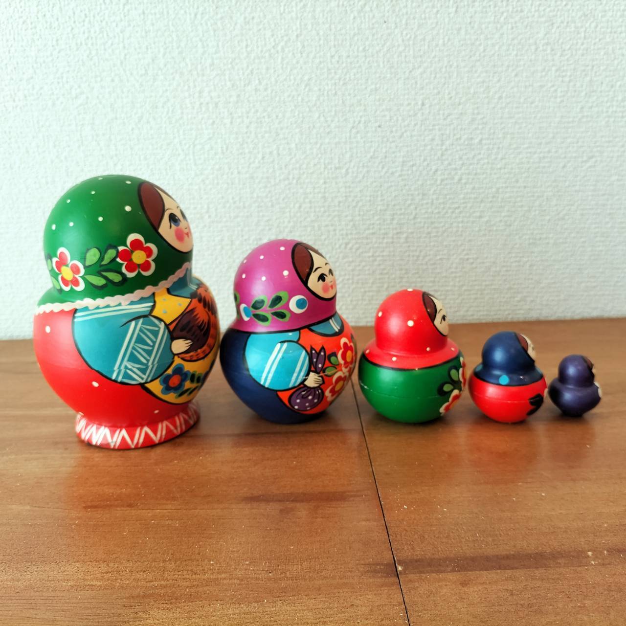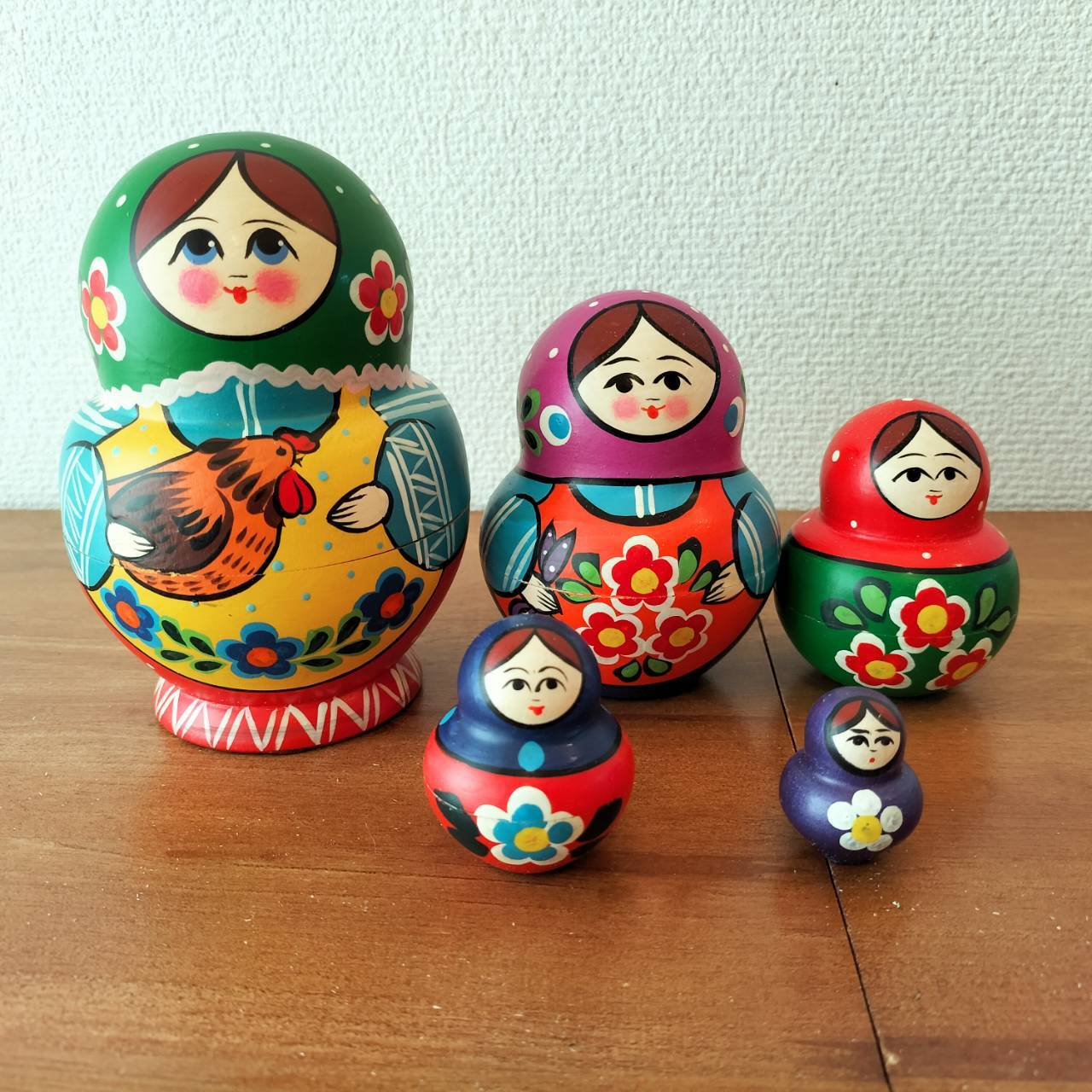 ロシアの職人さんによるハンドメイドの作品です。ロシア伝統の原色系べた塗りのカラフルな木製工芸品・マトリョーシカです。自然木の香りがします。