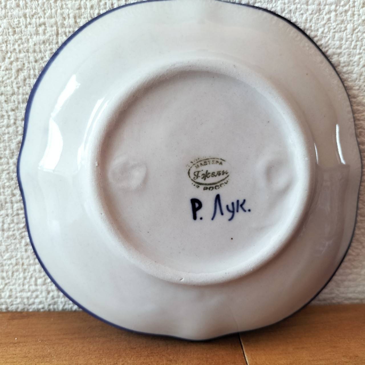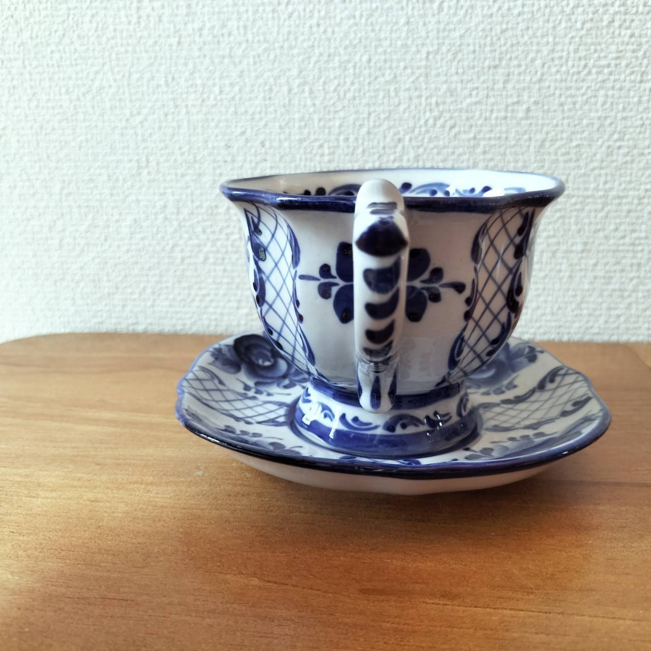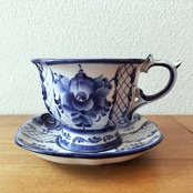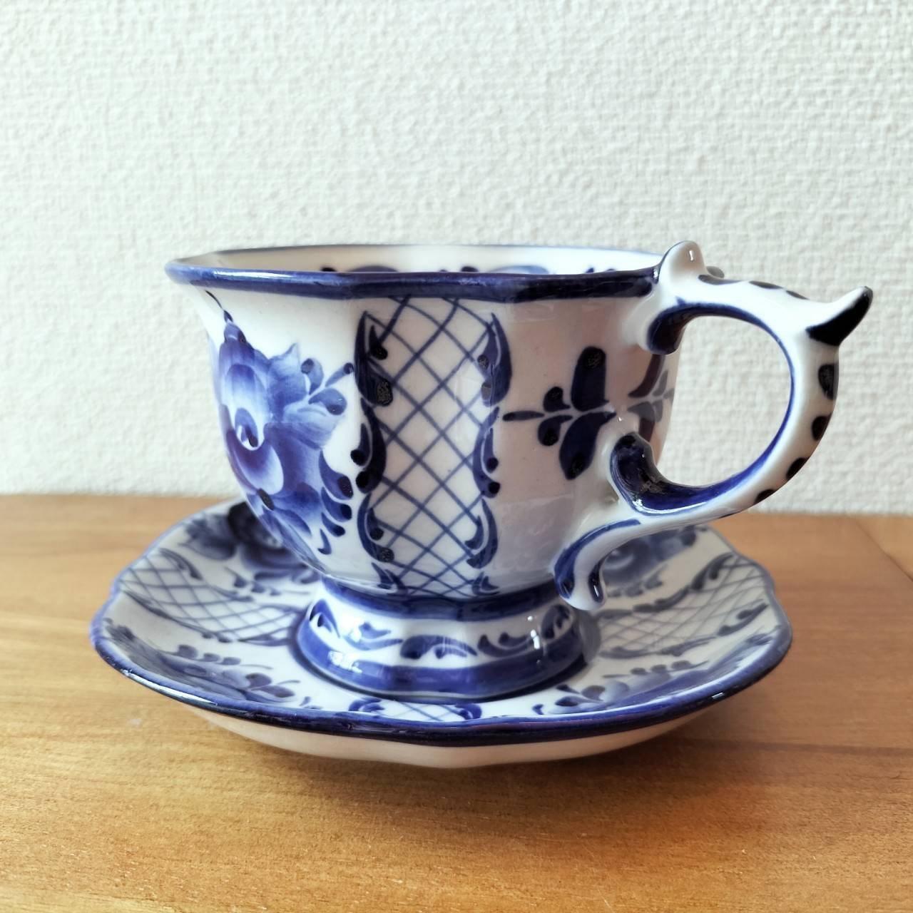 ロシアの伝統陶芸品、グジェリ焼です。ティーカップで、ソーサーつきです。グジェリ焼きのマグカップはコーヒーの色にとっても似合います。ティータイムにいかがでしょうか?