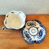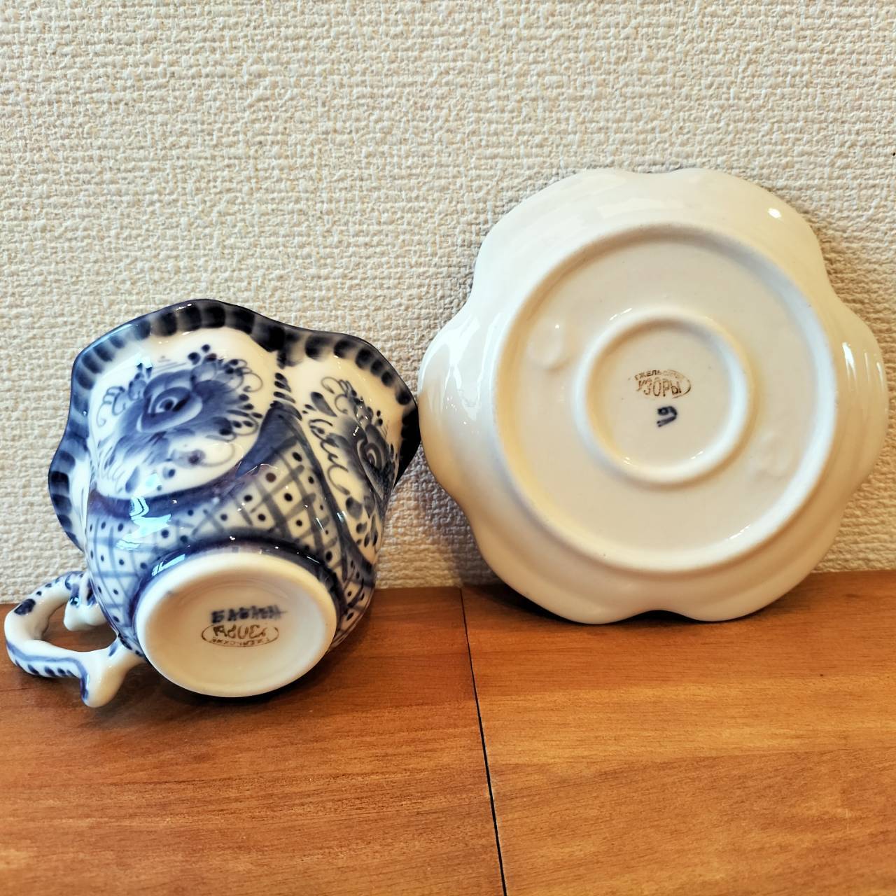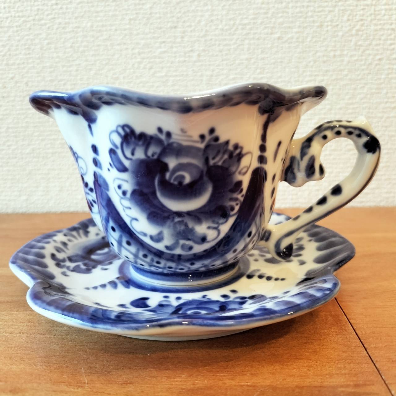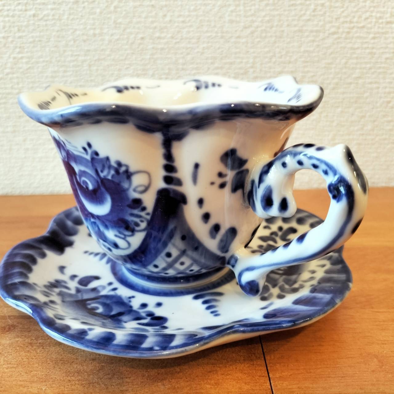 ロシアの伝統陶芸品、グジェリ焼です。ティーカップで、ソーサーつきです。グジェリ焼きのマグカップはコーヒーの色にとっても似合います。ティータイムにいかがでしょうか?
