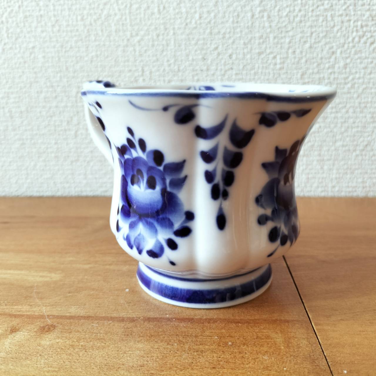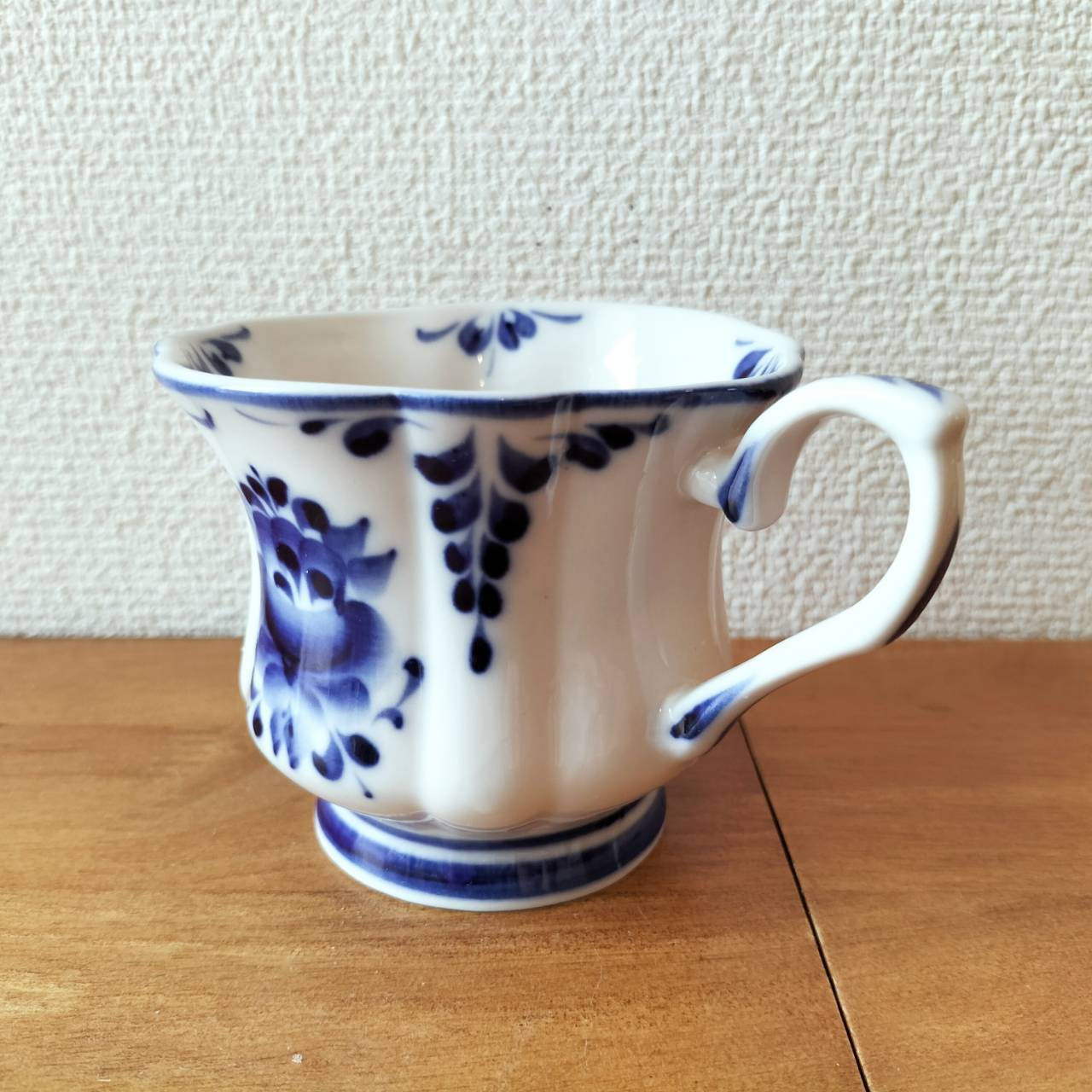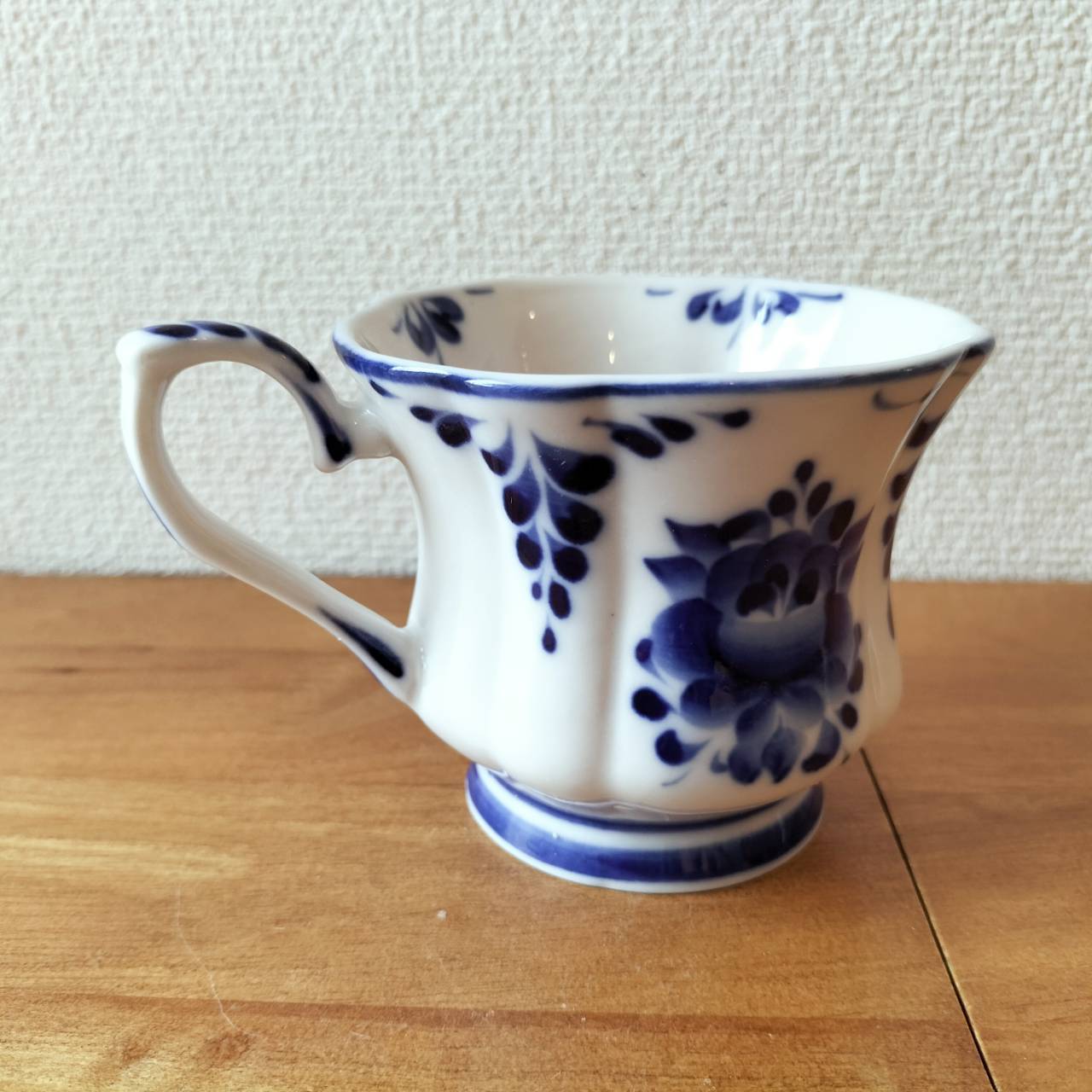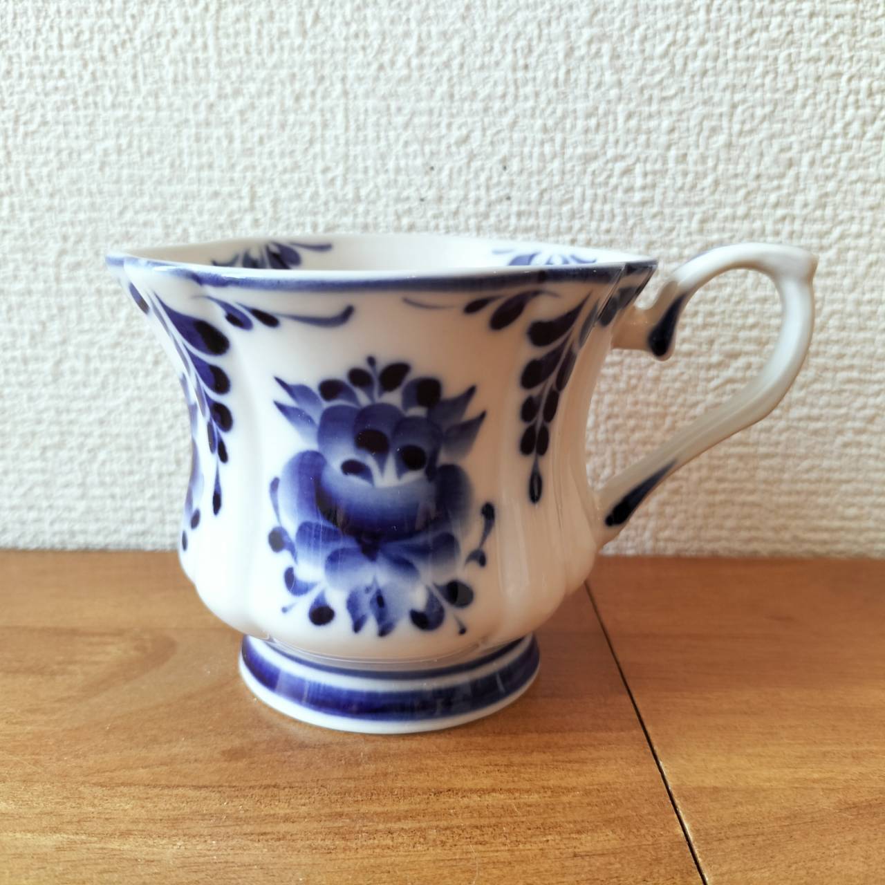 ロシアの伝統陶芸品、グジェリ焼です。ティーカップです。グジェリ焼きのマグカップはコーヒーの色にとっても似合います。ティータイムにいかがでしょうか?