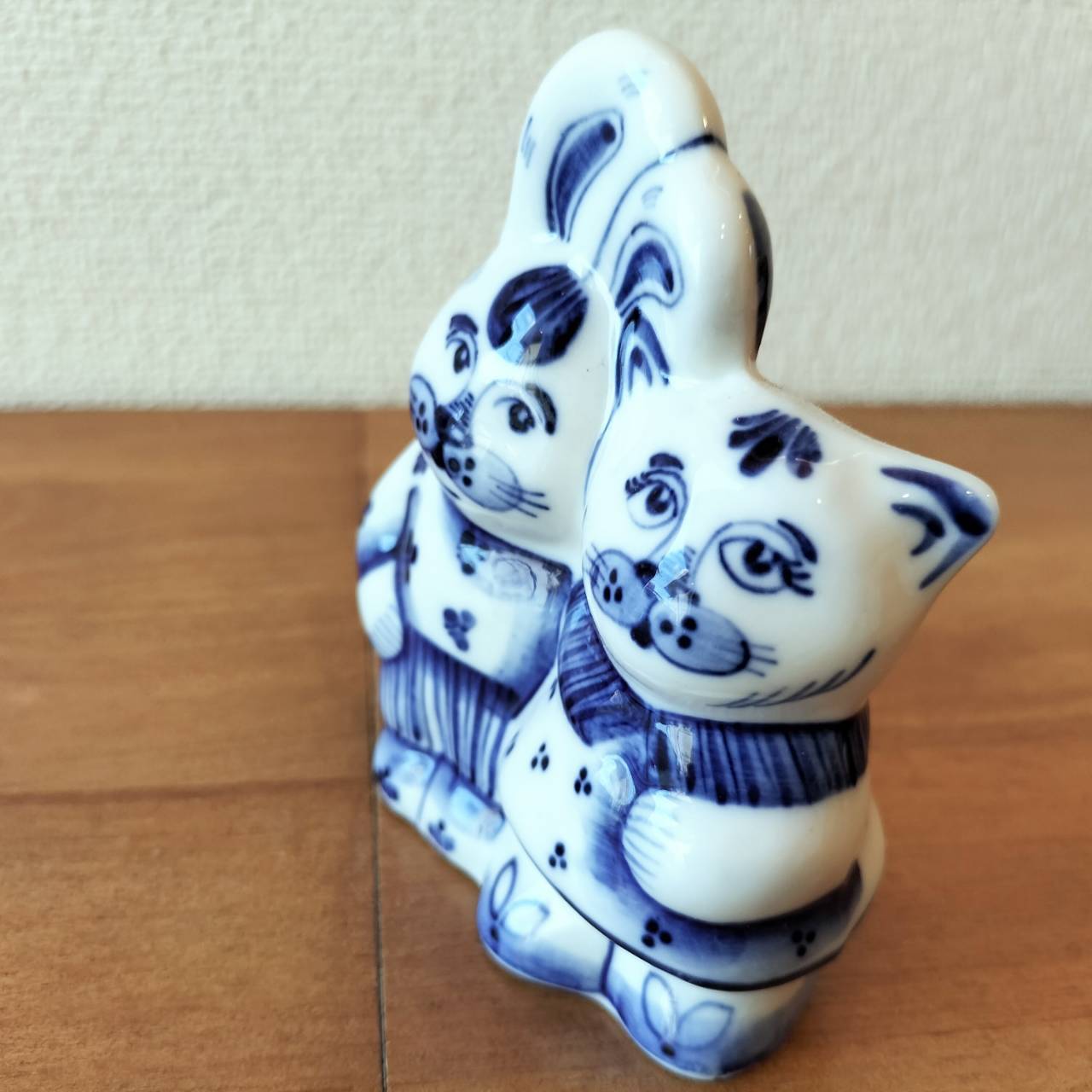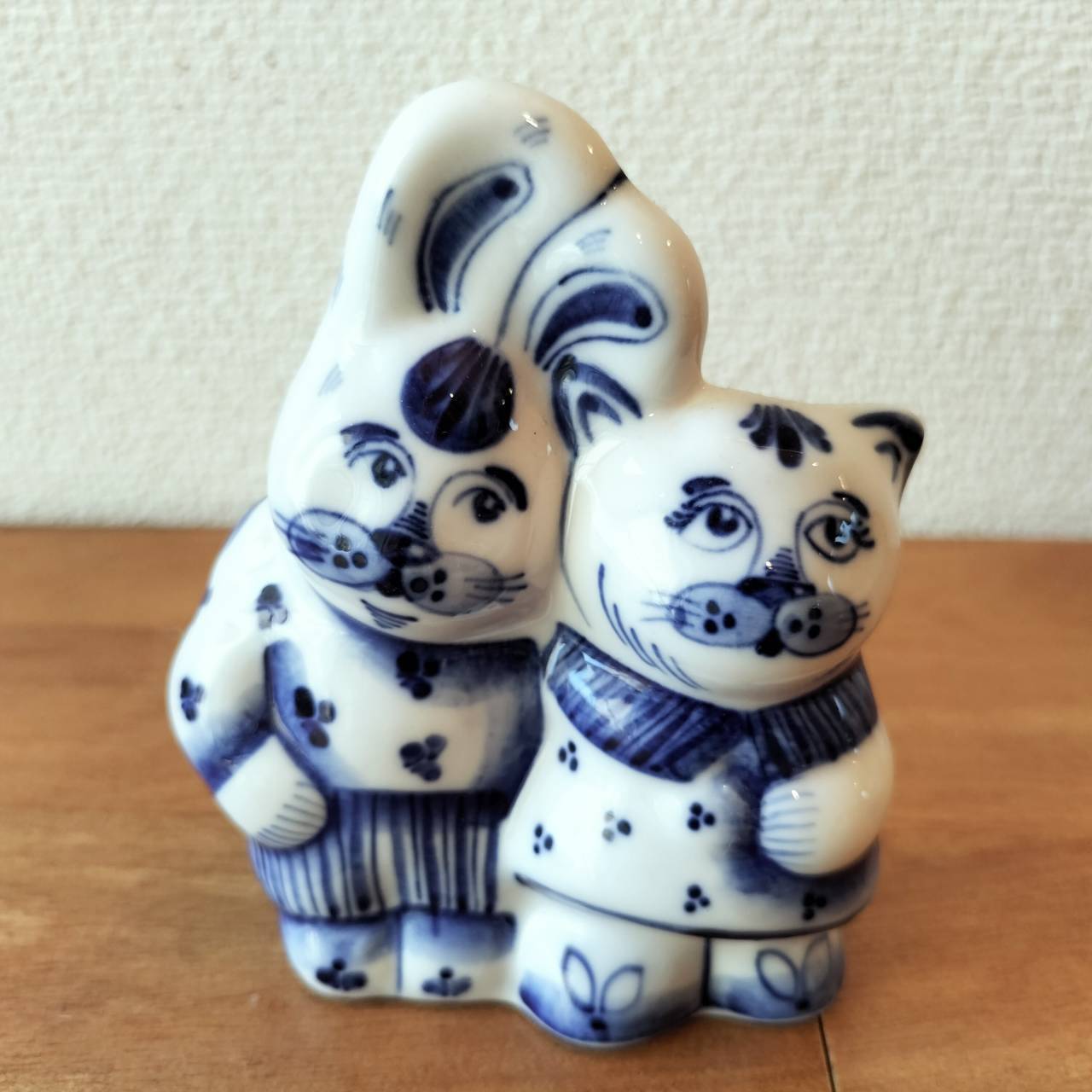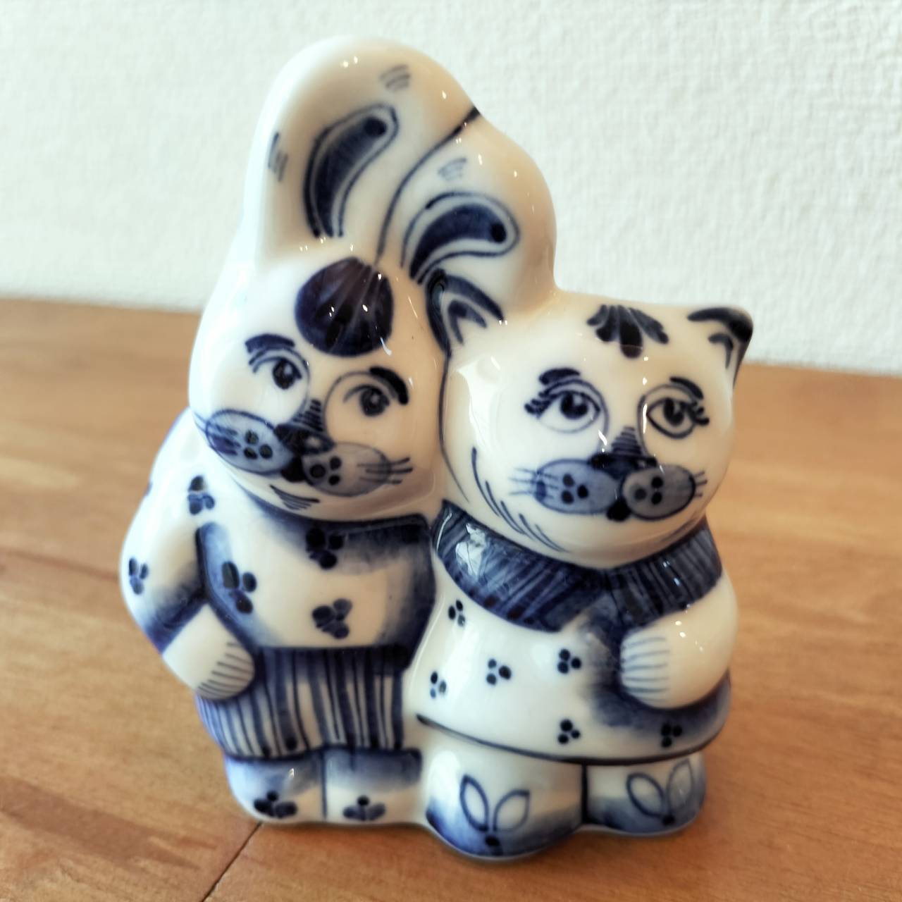 【GZ275】北欧ロシア雑貨 動物陶器 グジェリ焼 仲良しの猫とウサギ