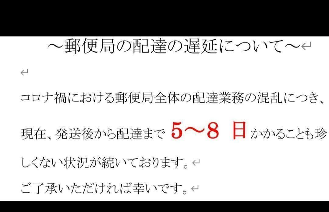 ●郵便局職員のコロナ感染拡大により、現在、発送から到着までに5日以上かかることがあっても珍しくない状況です。