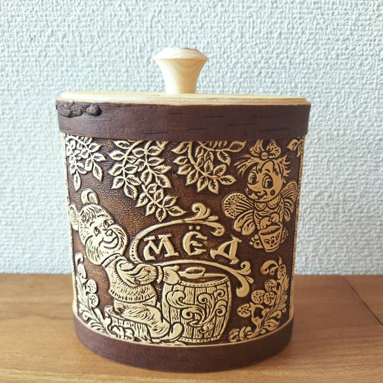 ロシア・北欧の小物入れ、ベレスタです。白樺の真皮で作られている白樺細工です。ベレスタ職人のハンドメイド作品のキャニスターです。はちみつを持つ熊とハチが描かれています。