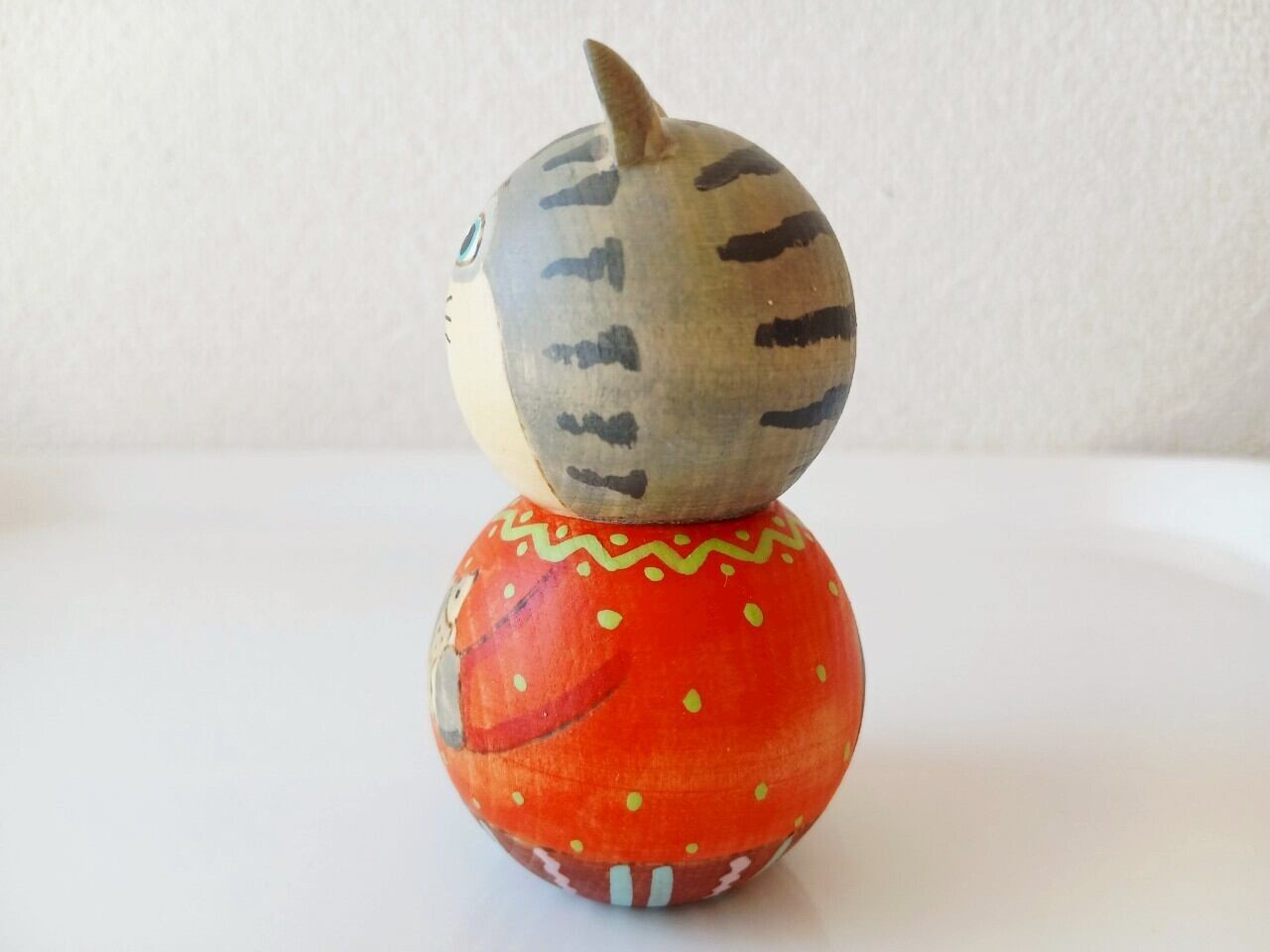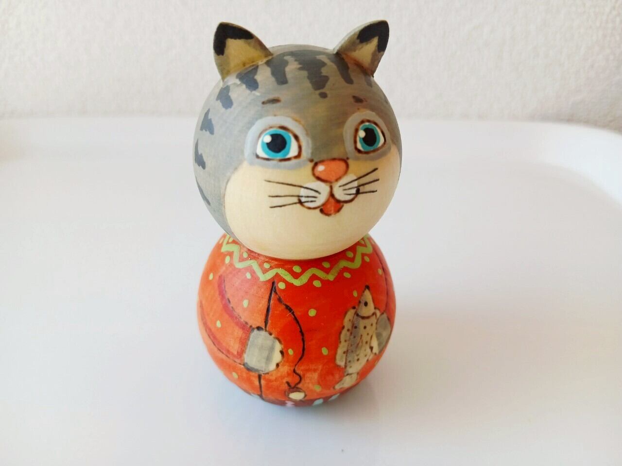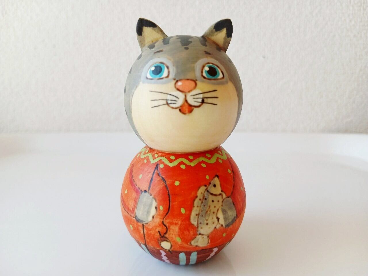 【LYH153】北欧ロシア雑貨 リューバ作 木製人形 釣りをするネコ