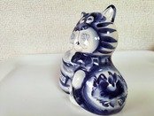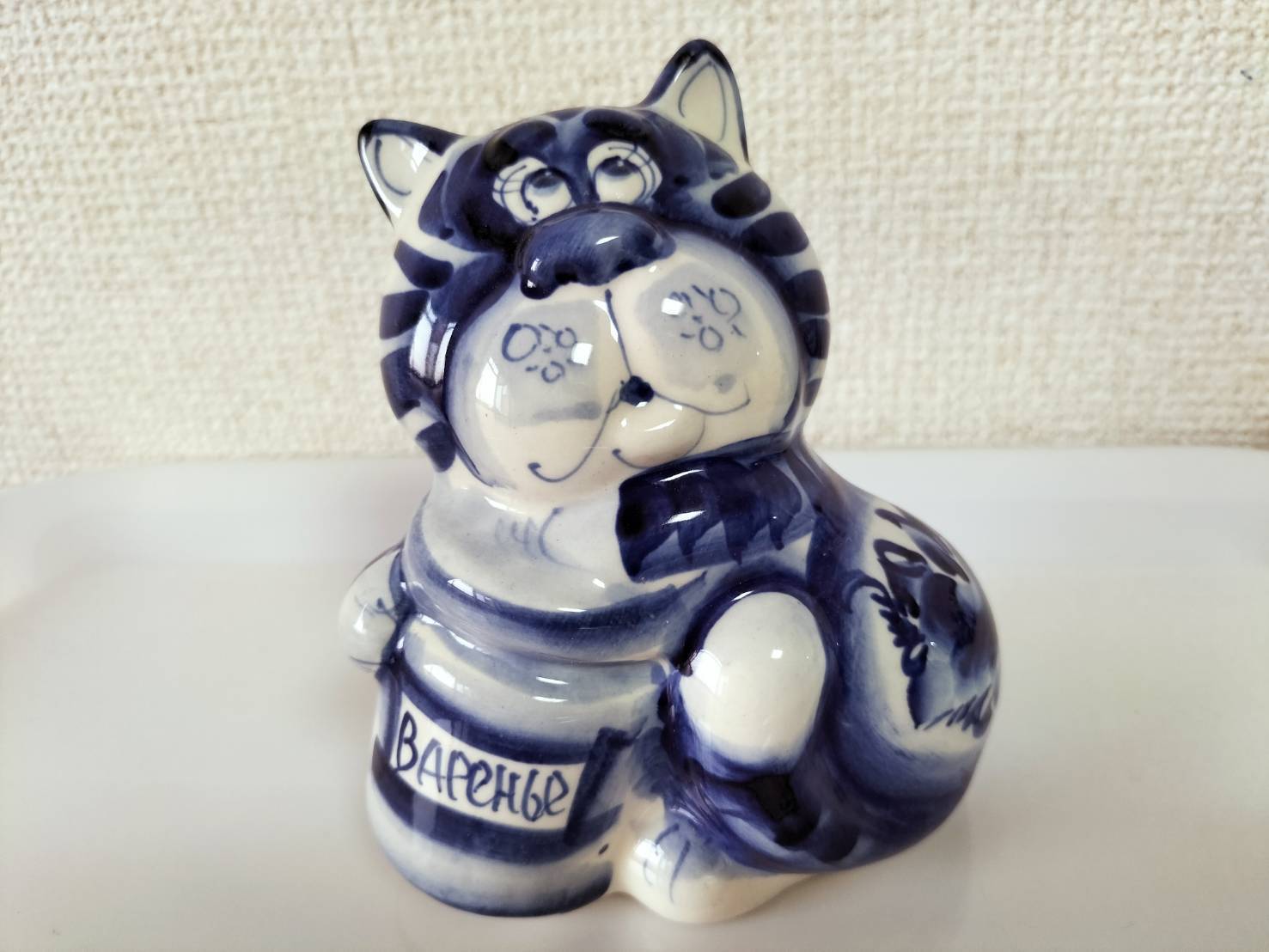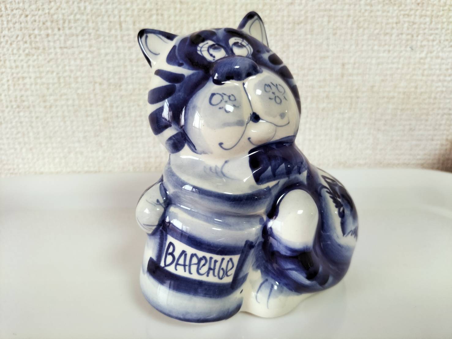 ロシアの伝統陶器、グジェリ焼です。варенье(ジャム)を漁るねこをモチーフにした陶器です。