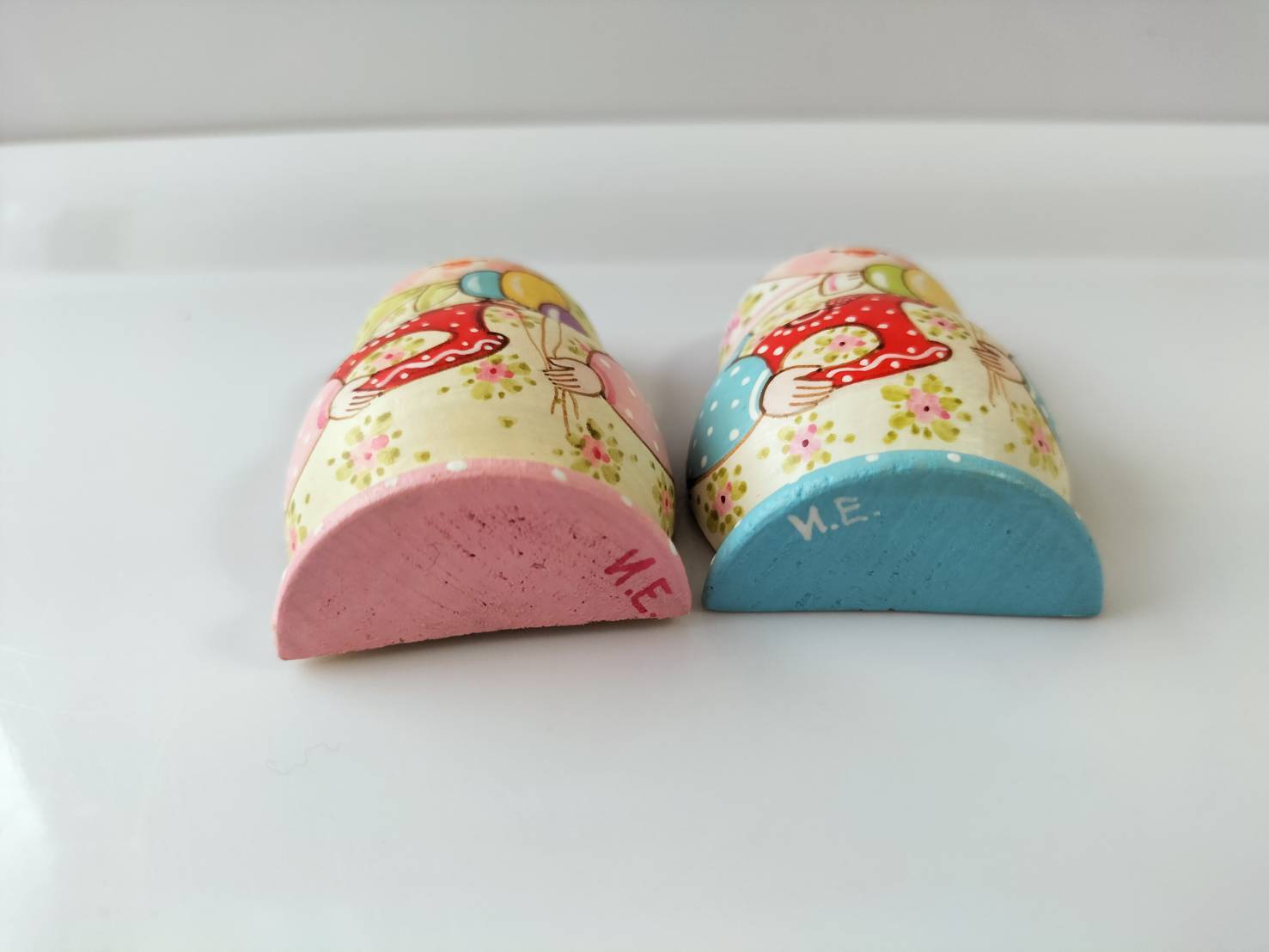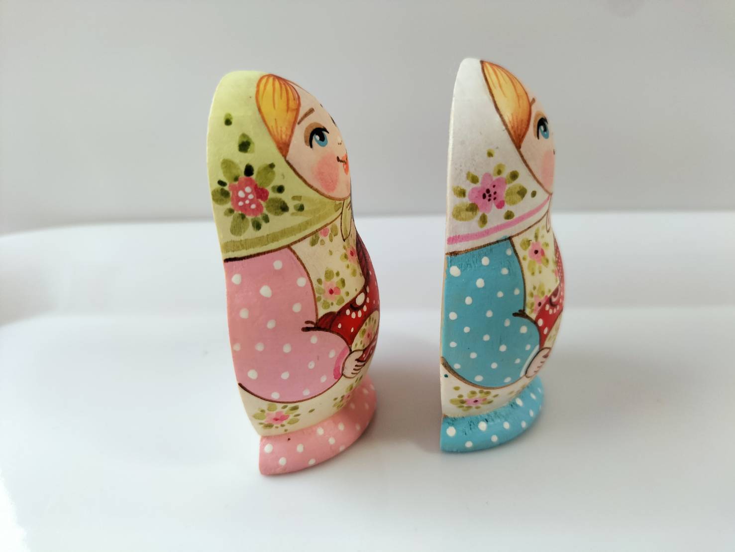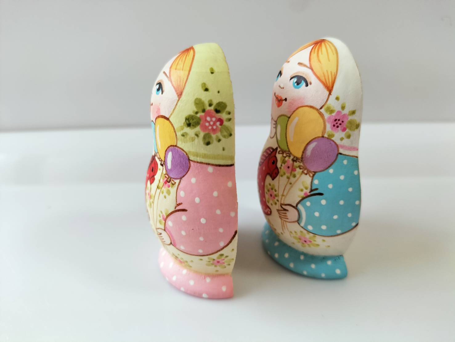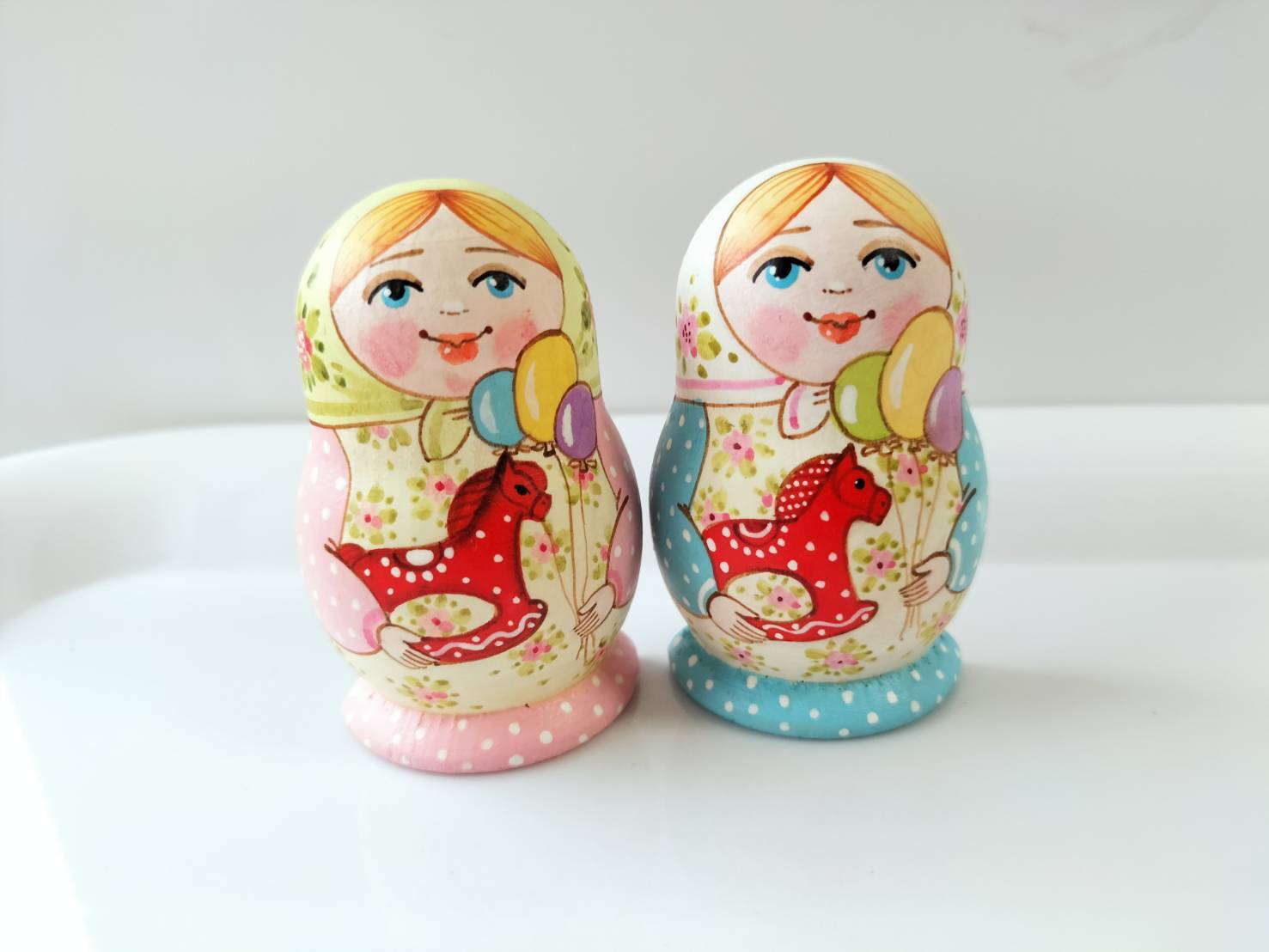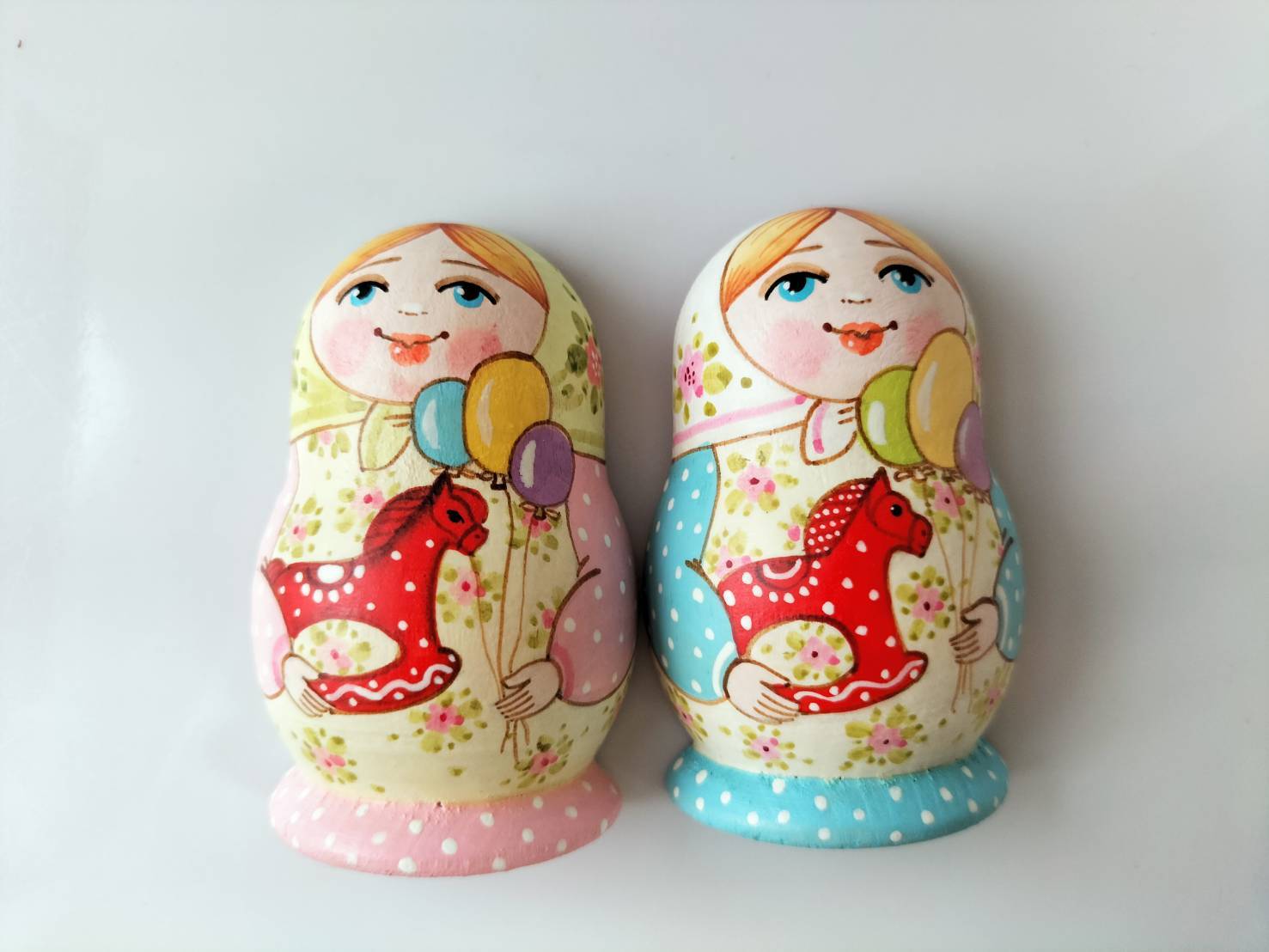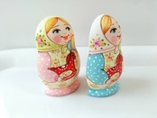彼女の描くマトリョーシカや起き上がりこぼしは、可愛らしい顔が特徴的です。パステルカラーな色彩は誰もが持つメルヘンチックな淡い童心を思い起こさせます。