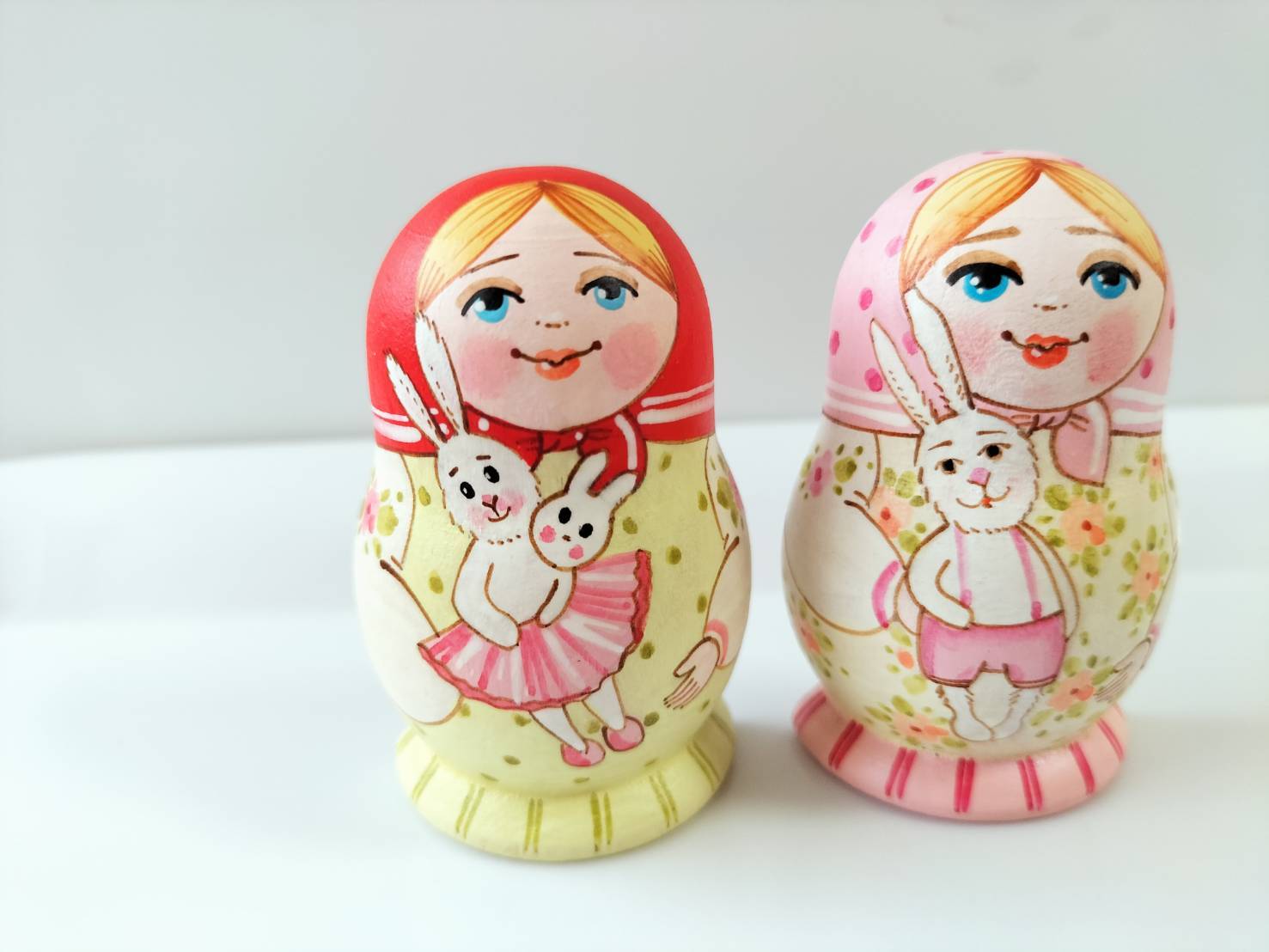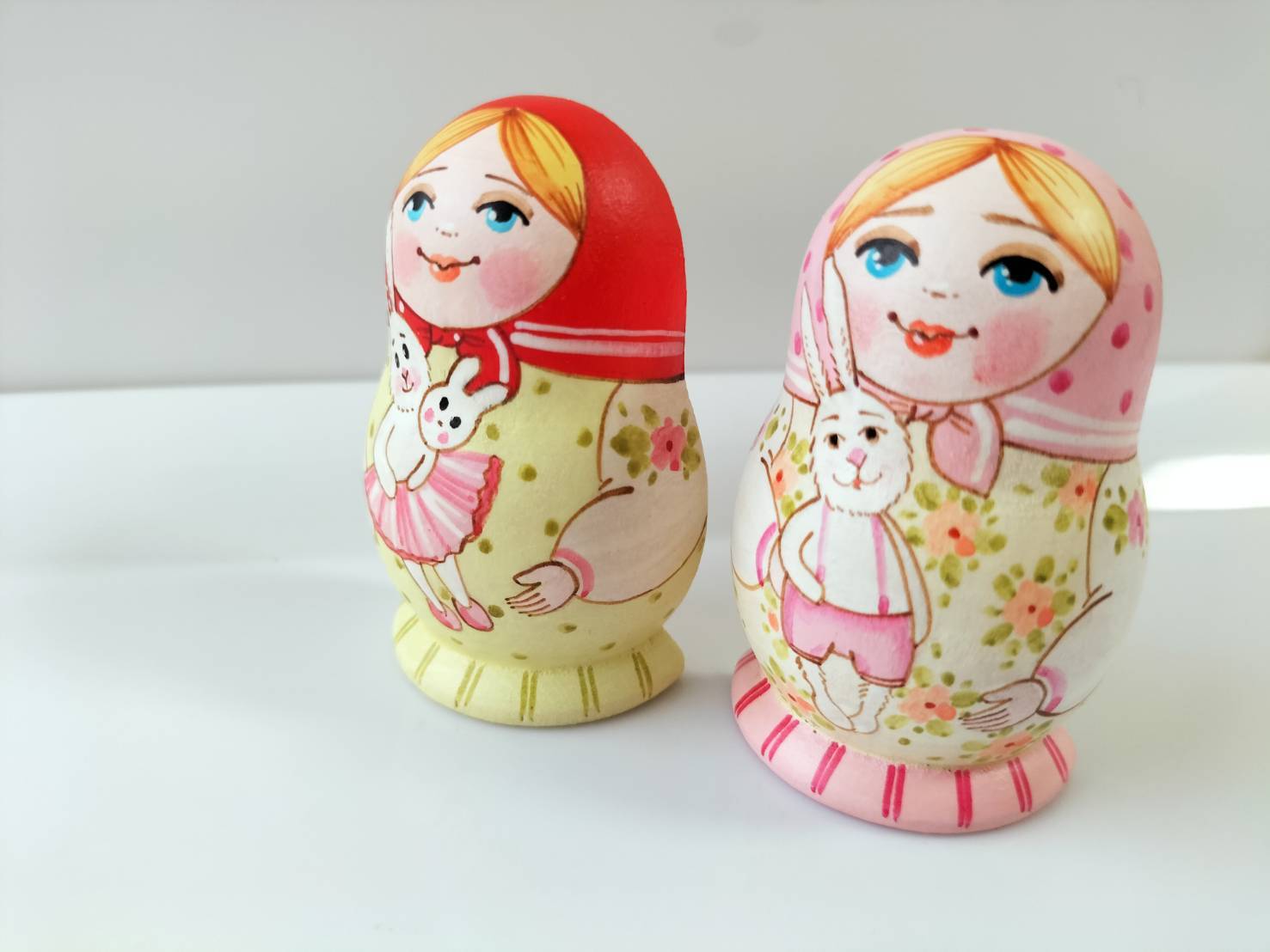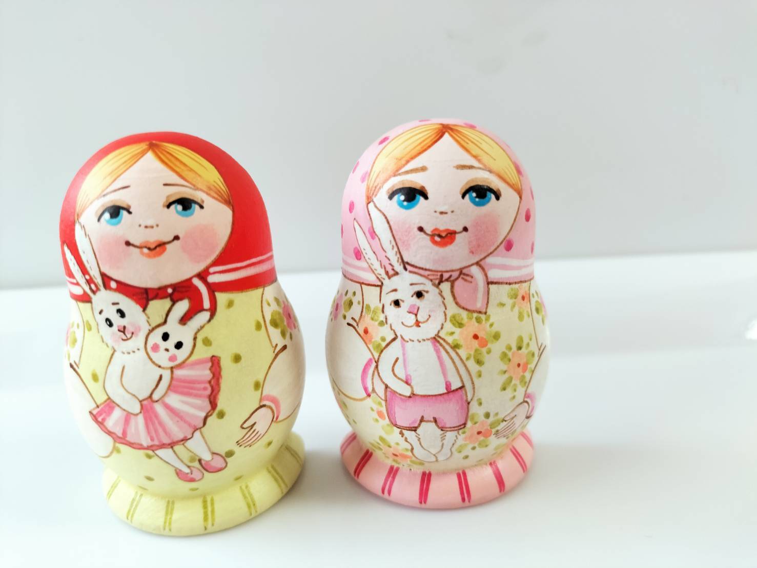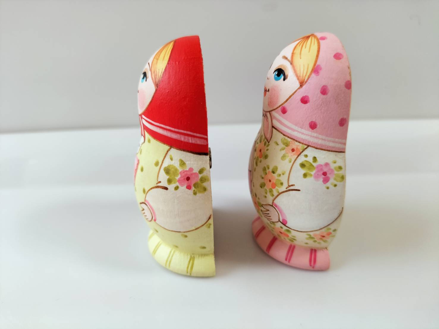 彼女の描くマトリョーシカや起き上がりこぼしは、可愛らしい顔が特徴的です。パステルカラーな色彩は誰もが持つメルヘンチックな淡い童心を思い起こさせます。