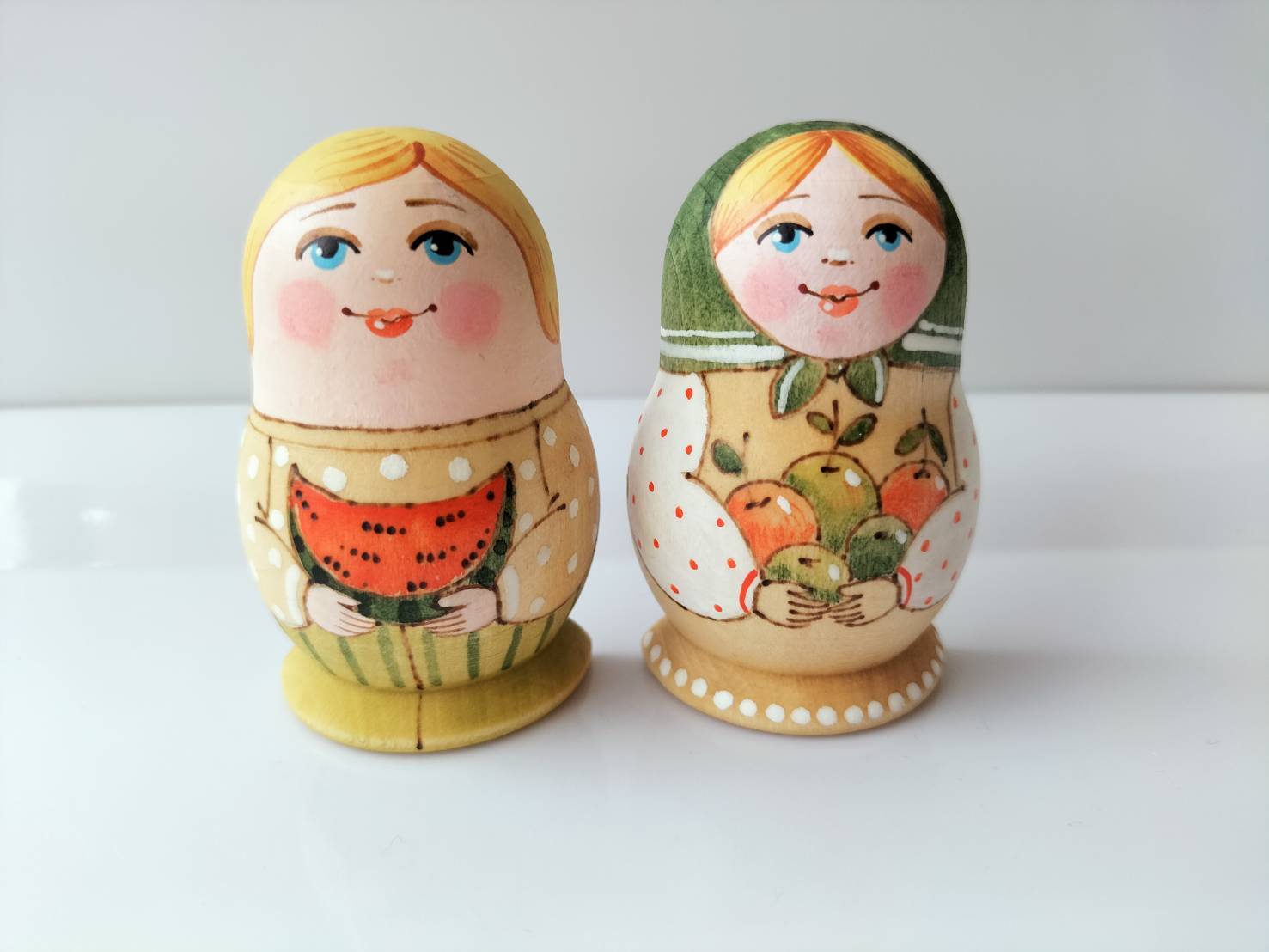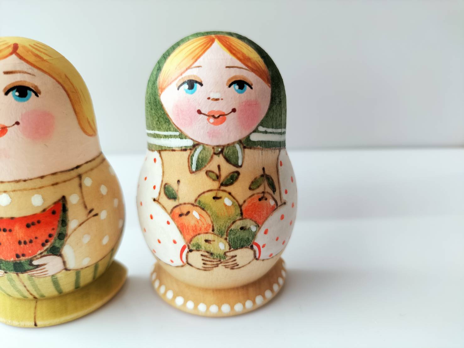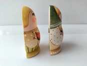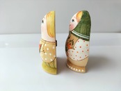 彼女の描くマトリョーシカや起き上がりこぼしは、可愛らしい顔が特徴的です。パステルカラーな色彩は誰もが持つメルヘンチックな淡い童心を思い起こさせます。