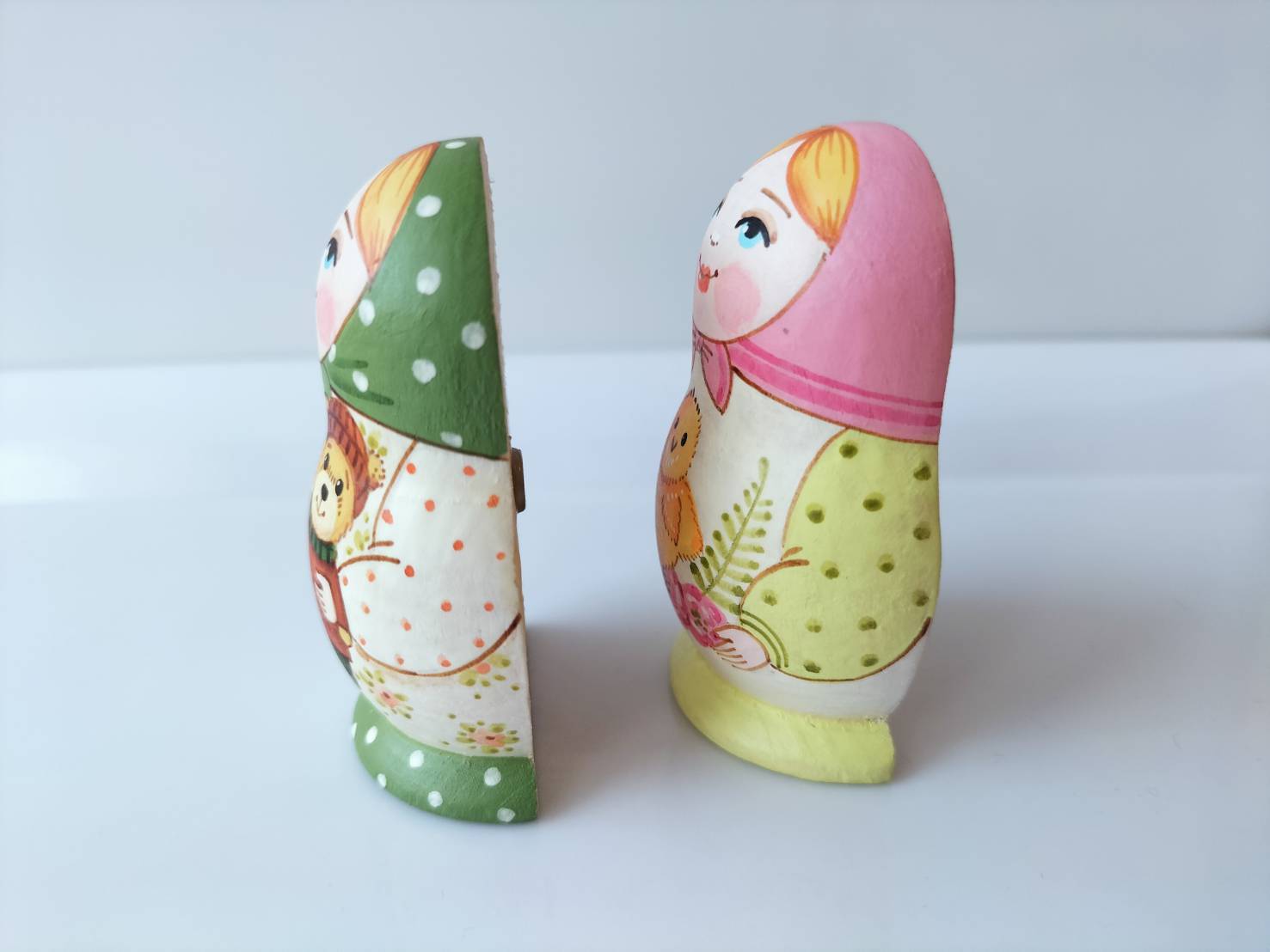 彼女の描くマトリョーシカや起き上がりこぼしは、可愛らしい顔が特徴的です。パステルカラーな色彩は誰もが持つメルヘンチックな淡い童心を思い起こさせます。