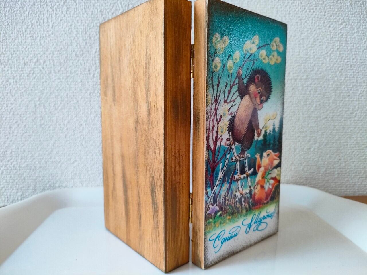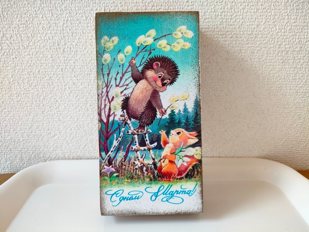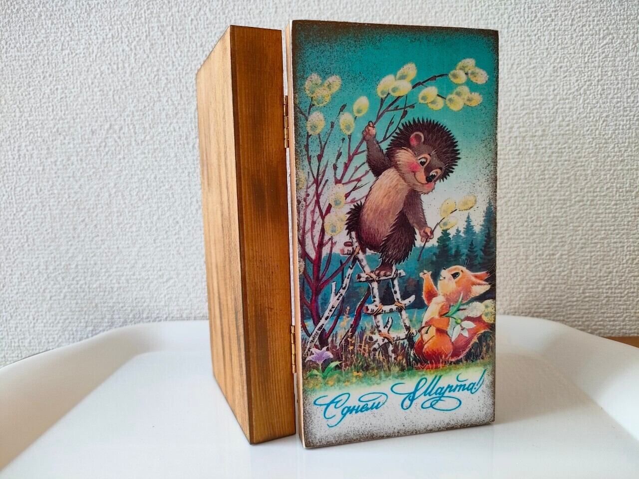 ソ連時代の有名な絵葉書のイラストプリントをかたどって作られた木箱です。