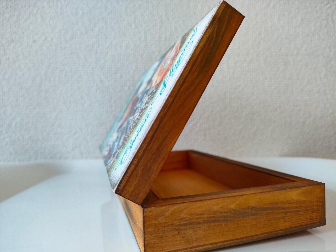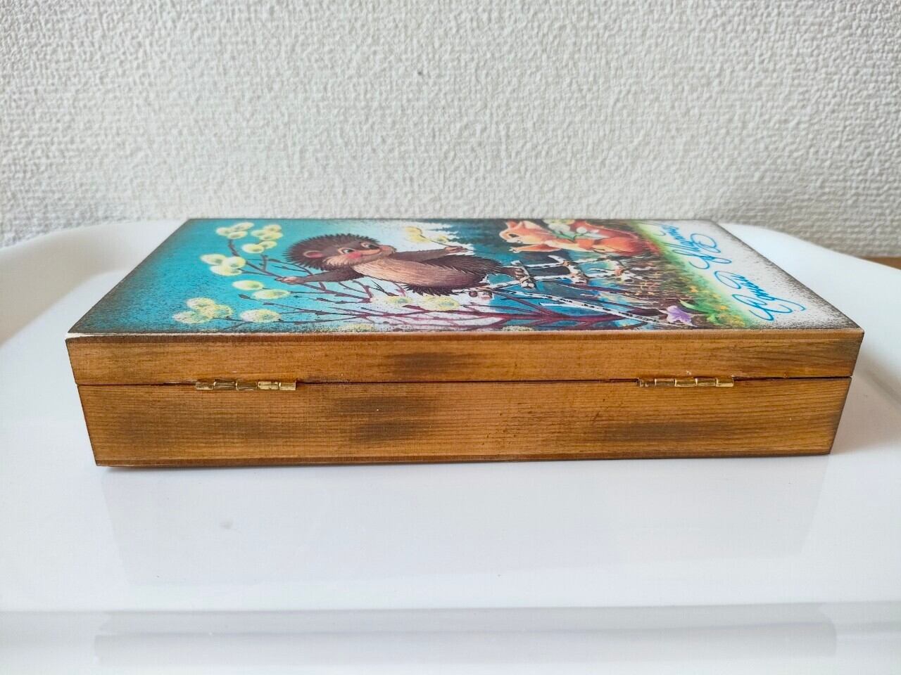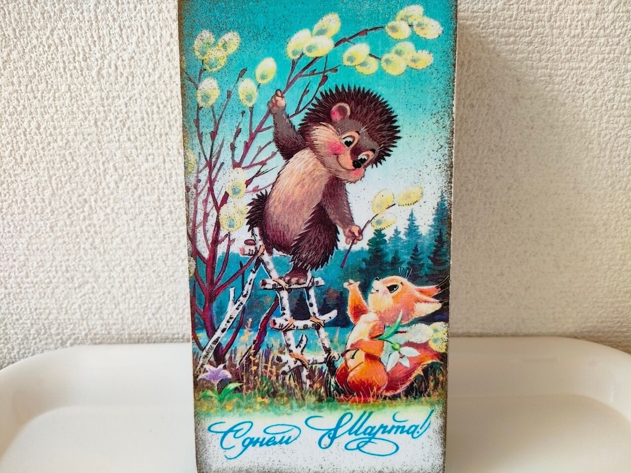 ソ連時代の有名な絵葉書のイラストプリントをかたどって作られた木箱です。