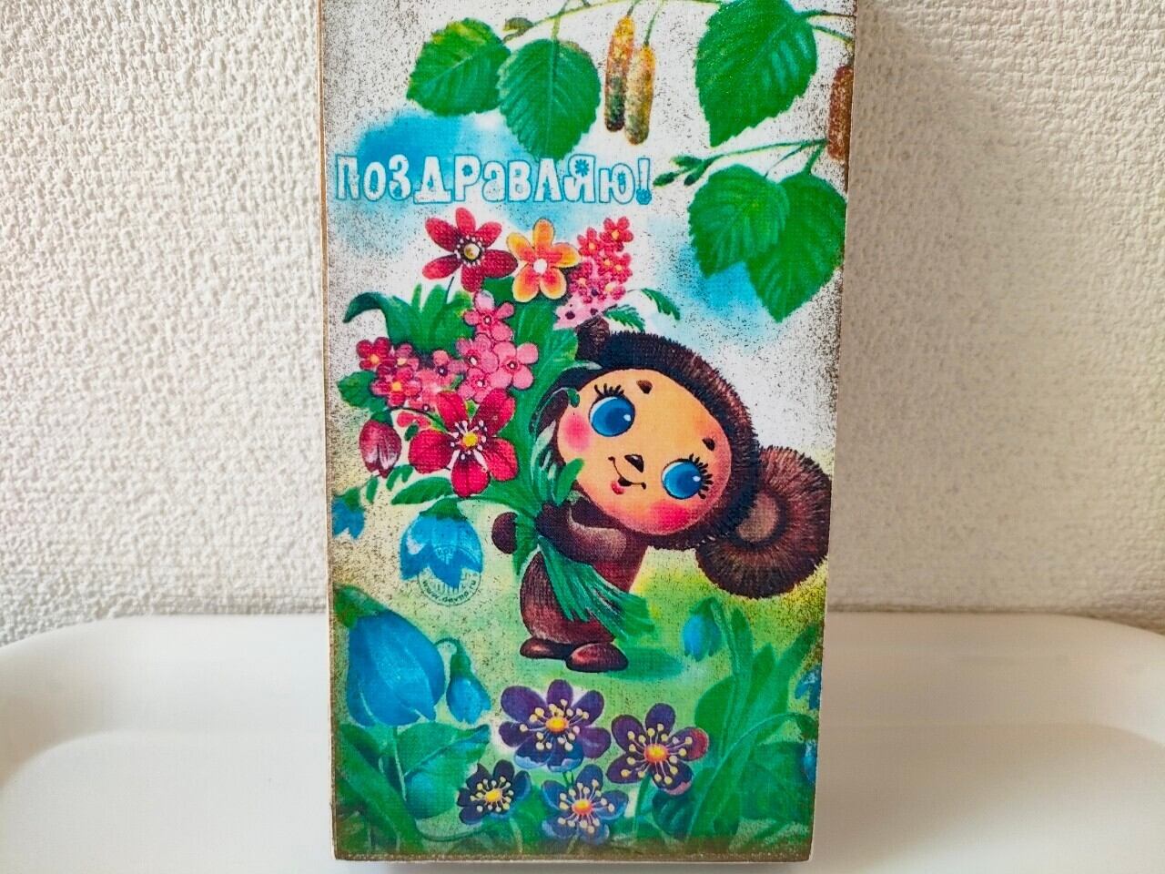 ソ連時代の有名な絵葉書のイラストプリントをかたどって作られた木箱です。