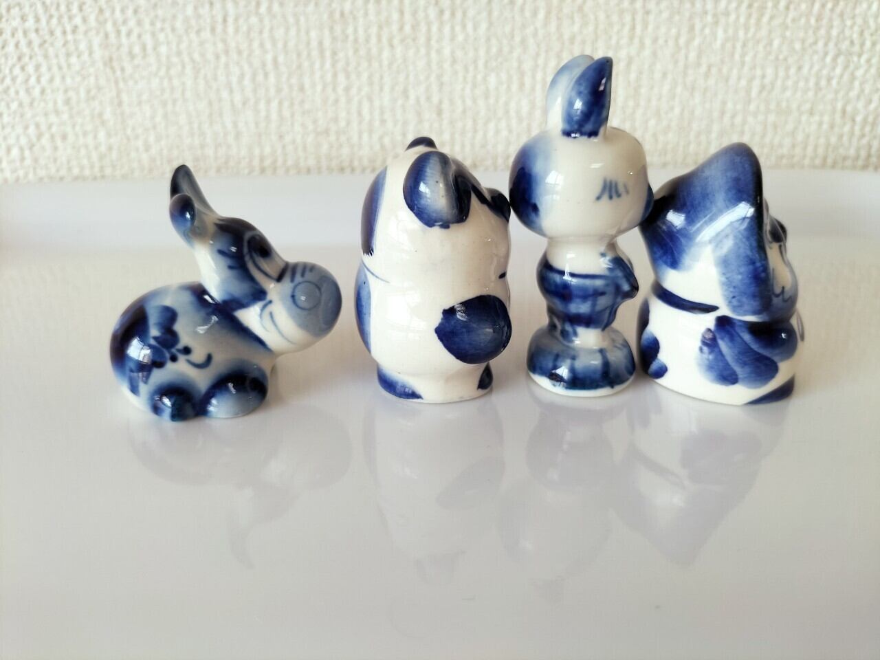 ロシアの伝統陶器、グジェリ焼です。北欧雑貨、東欧雑貨、レトロ(ヴィンテージ)雑貨が好きな方への贈り物にいかがでしょうか? 4体セット、ばら売り不可です。